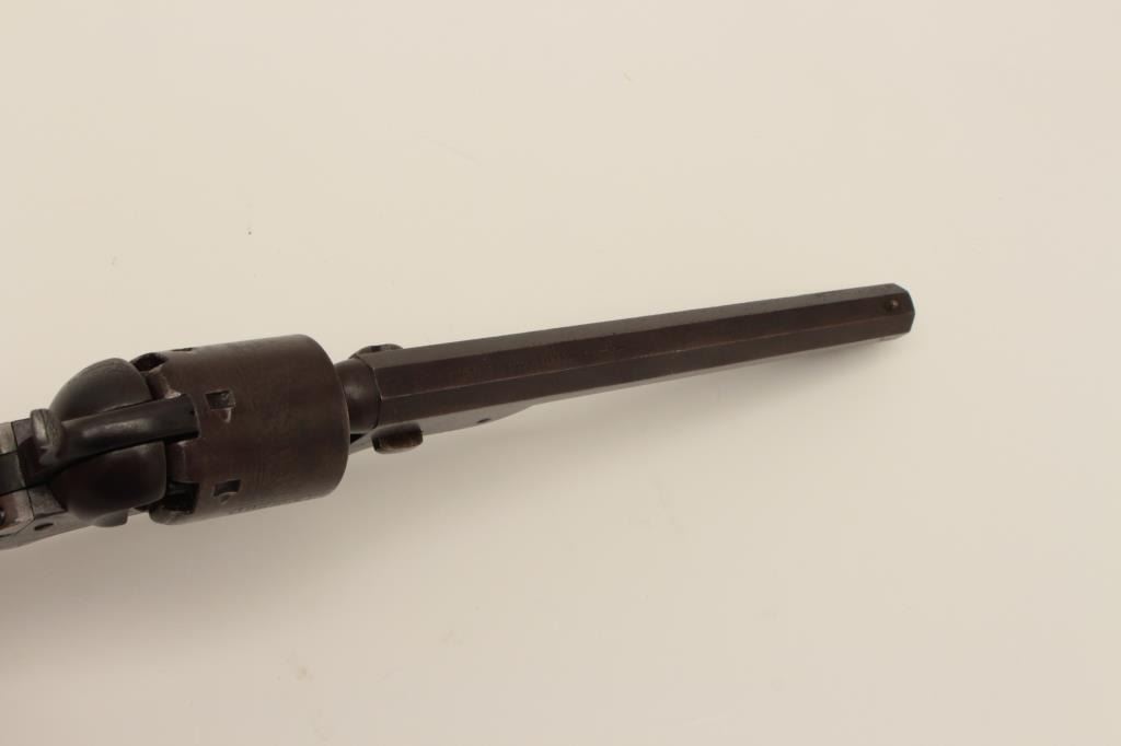 17HT-2 COLT NAVY #1453Colt 1851 Navy 2nd model squareback revolver, S/N 1453 in early production range and made in the California gold rush era. This revolver remains in good to very good original as found condition with traces offinish mixed in a brown patina. Scattered light to moderate pitting mostly on the barrel probably from holstering. The frame is crisp as is the cylinder with 70%-80% original scene remaining and good Ornsbysignature. Good barrel address and mostly visible very small Colt’s patent on the frame. The grips show 40%-60% varnish and are at least very good plus but not quite fine showing minor wear and aging. 90% plus thickold original sliver plate that is darkened. Some “tapping” marks on the bottom of the grips and strap. All matching visible serial numbers. An absolutely original and early 2nd model with the appearance collectors likeand above average for this variation. (Antique) Est.: $5,000-$10,000Colt 1851 Navy 2nd model squareback revolver, S/N 1453 in early production range and made in the California gold rush era. This revolver remains in good to very good original as found condition with traces offinish mixed in a brown patina. Scattered light to moderate pitting mostly on the barrel probably from holstering. The frame is crisp as is the cylinder with 70%-80% original scene remaining and good Ornsbysignature. Good barrel address and mostly visible very small Colt’s patent on the frame. The grips show 40%-60% varnish and are at least very good plus but not quite fine showing minor wear and aging. 90% plus thickold original sliver plate that is darkened. Some “tapping” marks on the bottom of the grips and strap. All matching visible serial numbers. An absolutely original and early 2nd model with the appearance collectors likeand above average for this variation. (Antique) Est.: $5,000-$10,000