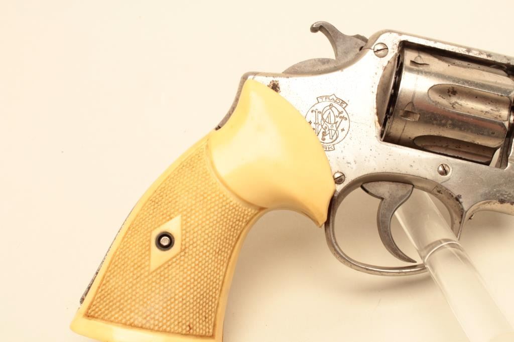 17JL-65 S&W 32-20Smith & Wesson Hand Ejector DA revolver, .32 Winchester caliber, 5” barrel, nickel finish, checkered faux ivory plastic grips, S/N 48697, in overall good to very good condition displaying the majority of its factorynickel finish, good bore, action, markings and older replacement grips. (C&R/PPT). Est.: $200-$400.Smith & Wesson Hand Ejector DA revolver, .32 Winchester caliber, 5” barrel, nickel finish, checkered faux ivory plastic grips, S/N 48697, in overall good to very good condition displaying the majority of its factorynickel finish, good bore, action, markings and older replacement grips. (C&R/PPT). Est.: $200-$400.