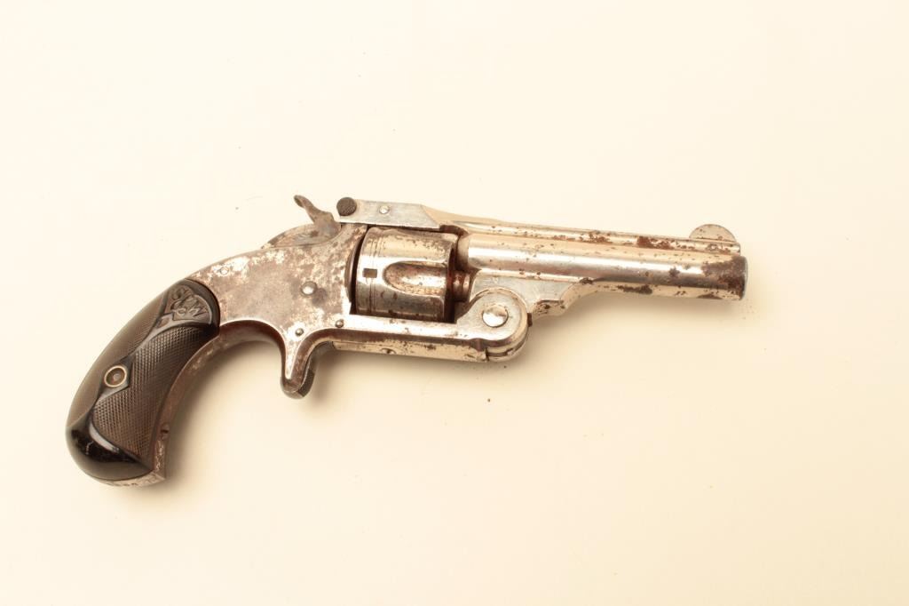 17JR-177 S&W SASmith & Wesson Model 1 ½ .32 caliber single action revolver with birds head grips, S/N 94206. This revolver shows a 3” barrel and 50%-70% original nickel. Some pitting and erosion which may clean somewhat as fresh.The grips are good and the address is good. Action not working. From old Palm Springs are collection. (Antique) Est.: $150-$300Smith & Wesson Model 1 ½ .32 caliber single action revolver with birds head grips, S/N 94206. This revolver shows a 3” barrel and 50%-70% original nickel. Some pitting and erosion which may clean somewhat as fresh.The grips are good and the address is good. Action not working. From old Palm Springs are collection. (Antique) Est.: $150-$300