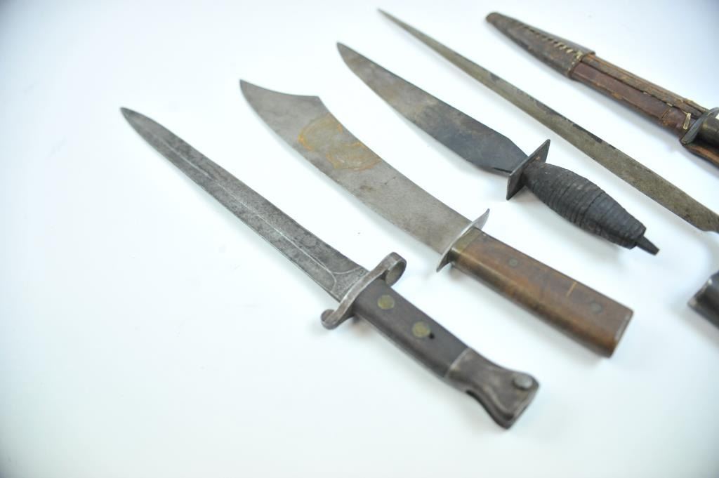 17JR-220 KNIFE LOTLot of 5 knives and bayonet. Chinese knife with flared blade. Another crude Asian knife with leather gasket grip. Mexican knife and scabbard. English Enfield bayonet marked “W. Munson, London”. Socket bayonet. Fair to good varied conditions. Est.: $100-$300Lot of 5 knives and bayonet. Chinese knife with flared blade. Another crude Asian knife with leather gasket grip. Mexican knife and scabbard. English Enfield bayonet marked “W. Munson, London”. Socket bayonet. Fair to good varied conditions. Est.: $100-$300