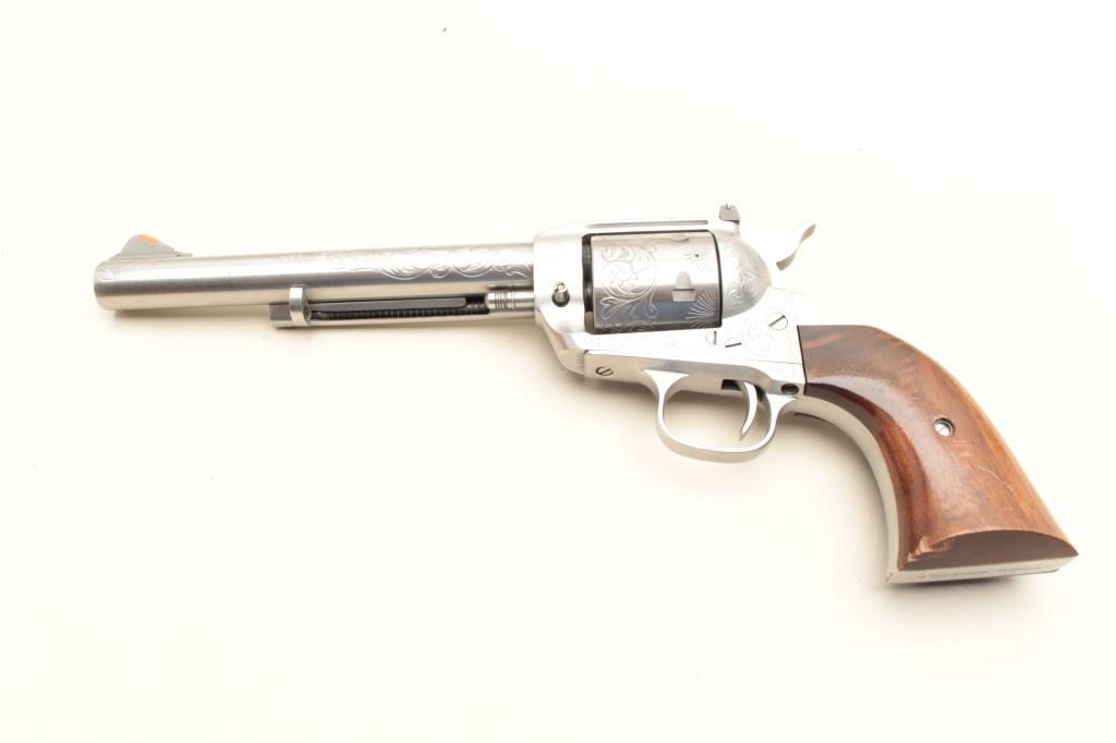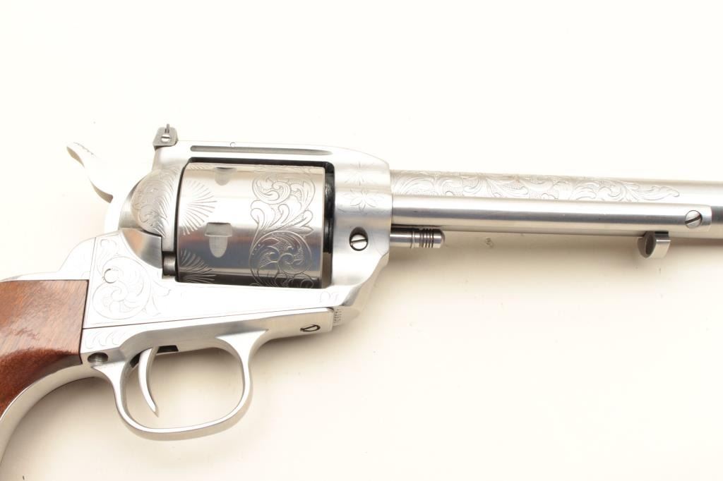 17KH-229 DRAGOONVirginia Dragoon/Interarms single action revolver, .44 magnum caliber, 7.5” barrel, engraved, stainless, wood grips, S/N S13931, in overall very good to near fine condition with a crisp action, tasteful engraving, very good markings and bore, good grips with a couple small dings to the bottom of the left grip. (Modern/PPT). Est.: $300-600Virginia Dragoon/Interarms single action revolver, .44 magnum caliber, 7.5” barrel, engraved, stainless, wood grips, S/N S13931, in overall very good to near fine condition with a crisp action, tasteful engraving, very good markings and bore, good grips with a couple small dings to the bottom of the left grip. (Modern/PPT). Est.: $300-600