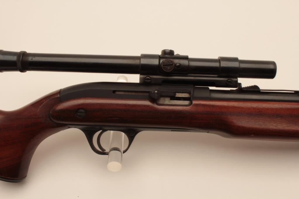 17KH-425 J.C. HIGGINS 31J.C. Higgins (probably by Marlin) Model 31 semi-automatic rifle, .22 short, long, LR caliber, blued finish, wood stock, no visible S/N, mounted with a Weaver B4 scope, in overall very good + condition; crisp action,sharp markings, very good bore and wood stock. (C&R/PPT). Est.: $100-$200.J.C. Higgins (probably by Marlin) Model 31 semi-automatic rifle, .22 short, long, LR caliber, blued finish, wood stock, no visible S/N, mounted with a Weaver B4 scope, in overall very good + condition; crisp action,sharp markings, very good bore and wood stock. (C&R/PPT). Est.: $100-$200.