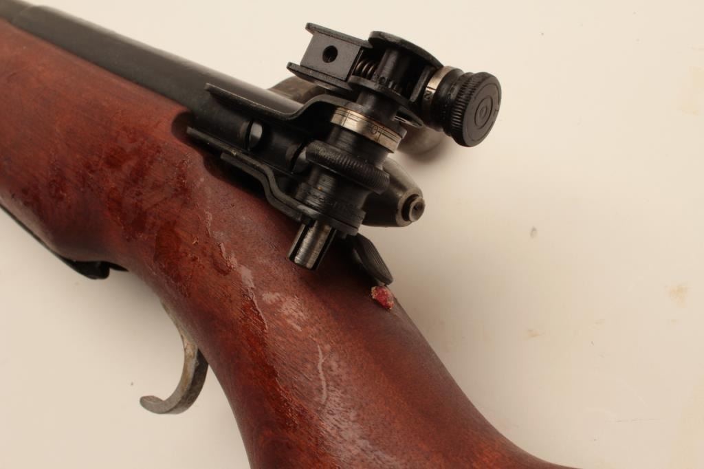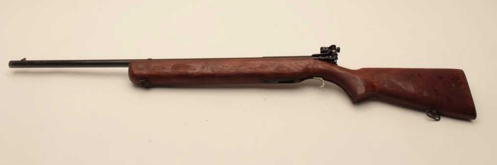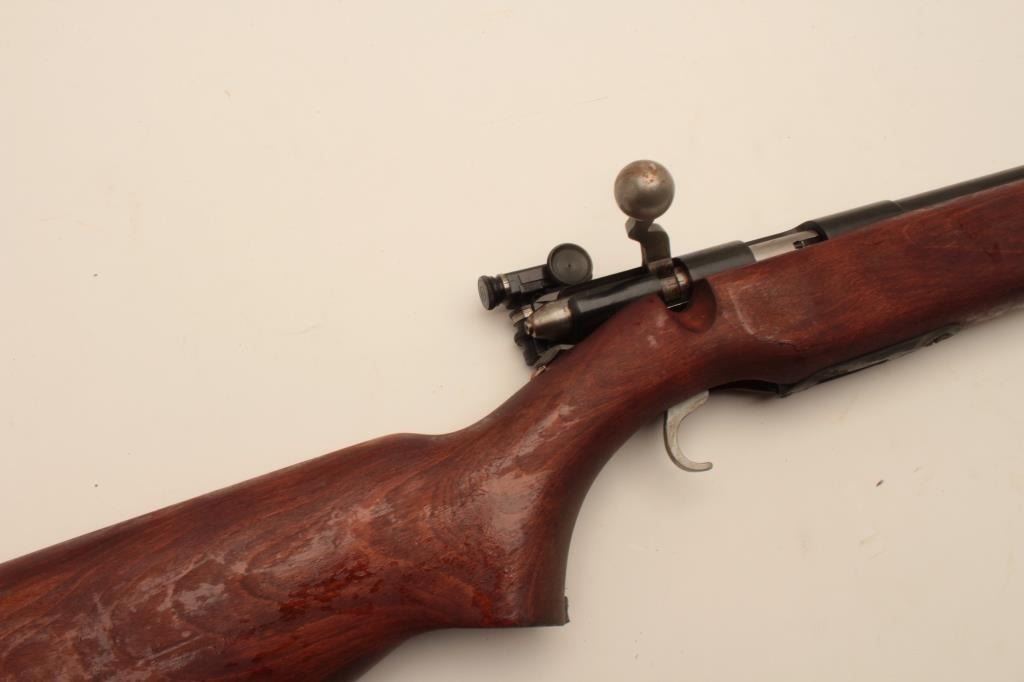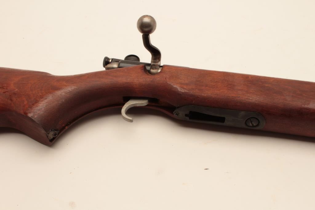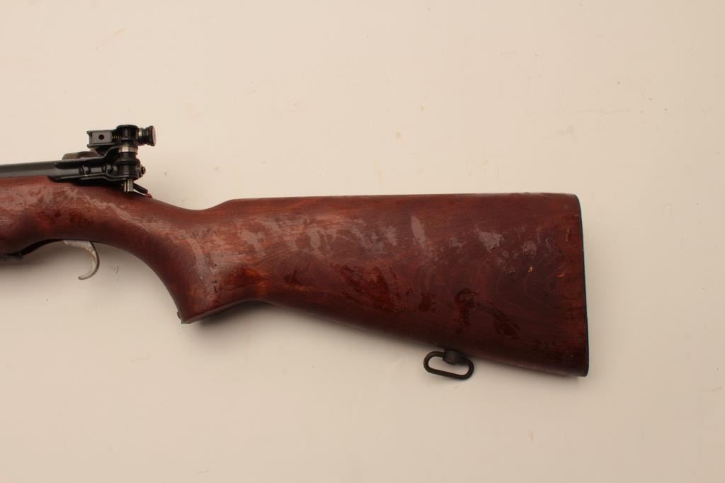 17KH-553 MOSSBERGU.S. Property-marked Mossberg Model 44 bolt action rifle, .22LR caliber, military finish, wood stock, U.S. Property S/N 147667; a project gun with missing trigger guard, action not working but good barrel, receiverand rear sight with stock that is partially coated in dried cosmoline that may clean to good; no magazine. (C&R/PPT). Est.: $100-$200.U.S. Property-marked Mossberg Model 44 bolt action rifle, .22LR caliber, military finish, wood stock, U.S. Property S/N 147667; a project gun with missing trigger guard, action not working but good barrel, receiverand rear sight with stock that is partially coated in dried cosmoline that may clean to good; no magazine. (C&R/PPT). Est.: $100-$200.