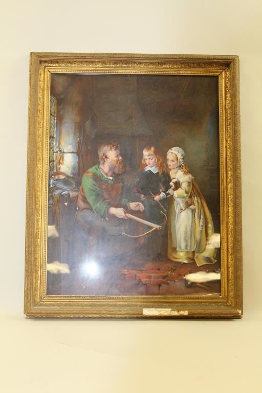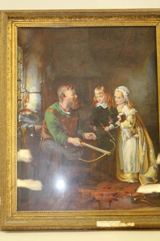 17KT-26 CROSSBOWFinely hand colored lithograph of armor showing crossbow to young squire and young lady holding spaniel puppy. Measures 24” x 18 ½” in same vintage Victorian frame showing damage to gesso and gilt. Est.: $350-$700Finely hand colored lithograph of armor showing crossbow to young squire and young lady holding spaniel puppy. Measures 24” x 18 ½” in same vintage Victorian frame showing damage to gesso and gilt. Est.: $350-$700