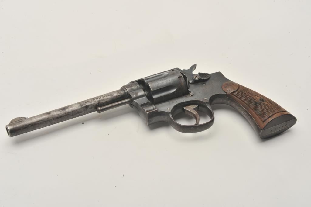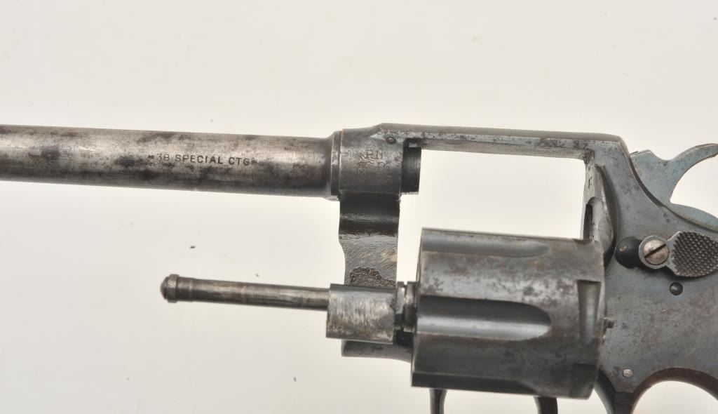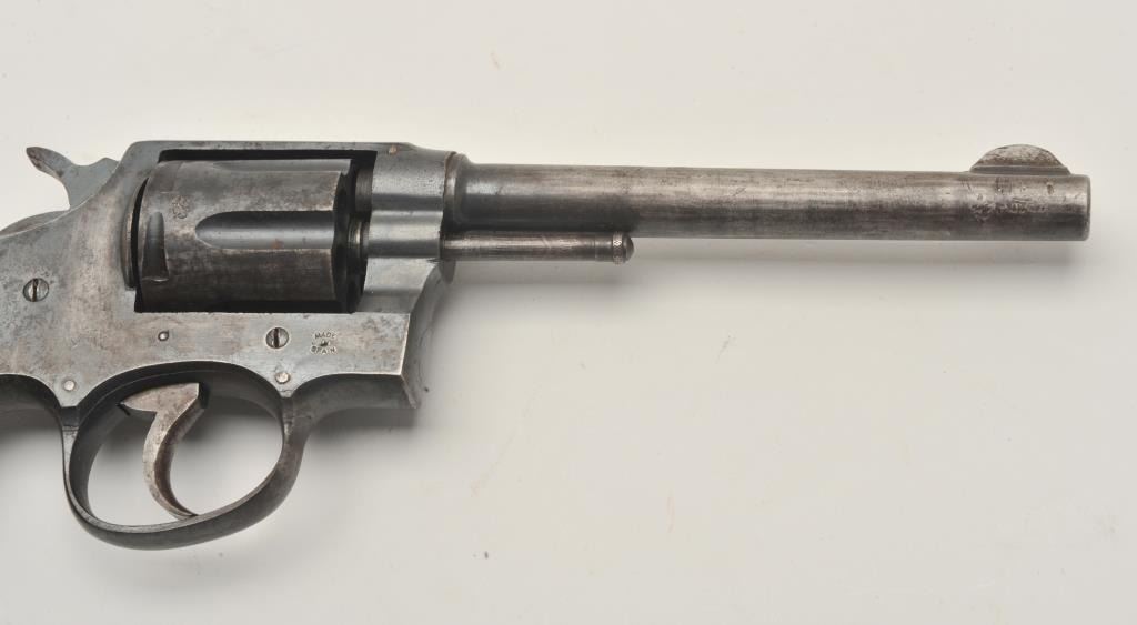 17LB-5 EIBAR COPY OF S&W #32726Eibar copy of a Smith & Wesson DA hand ejector revolver, .38 Special caliber, blued finish, checkered wood grips, S/N 32726, in overall fair + condition showing old cleaning to cylinder and barrel with scattered spotsof erosion, working action, fair bore and markings; good grips. (Modern/no PPT). Est.: $75-$150.Eibar copy of a Smith & Wesson DA hand ejector revolver, .38 Special caliber, blued finish, checkered wood grips, S/N 32726, in overall fair + condition showing old cleaning to cylinder and barrel with scattered spotsof erosion, working action, fair bore and markings; good grips. (Modern/no PPT). Est.: $75-$150.