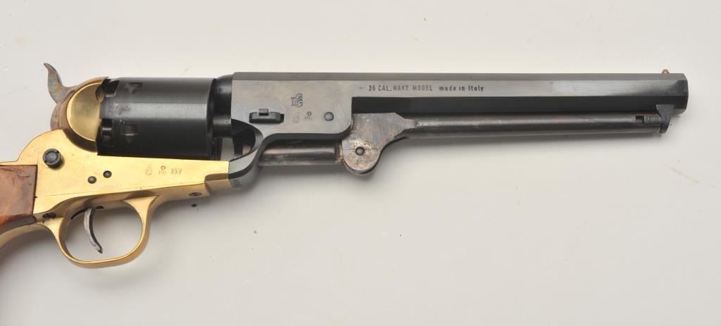 17LB-8 HAWES COPY OF 1851 #1696Italian made modern copy of a Model 1851 Navy revolver, .36 caliber, imported by Hawes, brass frame and straps, blued barrel and cylinder, case hardened rammer, wood grips, S/N 4696, in overall fine condition and in apartitioned wood display case with accessories and accompanied by a brass mounted wooden shoulder stock. (Percussion). Est.: $150-$300.Italian made modern copy of a Model 1851 Navy revolver, .36 caliber, imported by Hawes, brass frame and straps, blued barrel and cylinder, case hardened rammer, wood grips, S/N 4696, in overall fine condition and in apartitioned wood display case with accessories and accompanied by a brass mounted wooden shoulder stock. (Percussion). Est.: $150-$300.