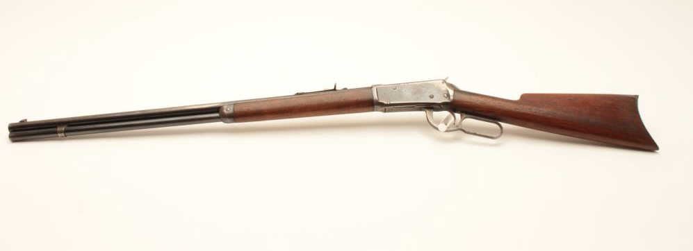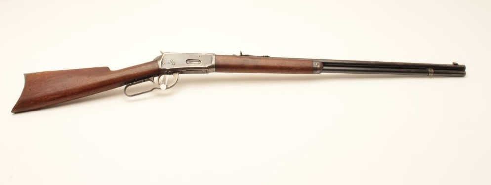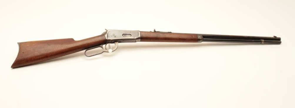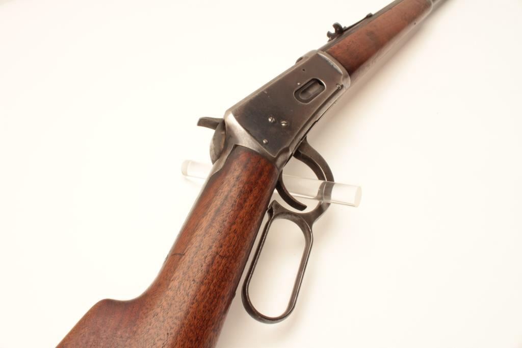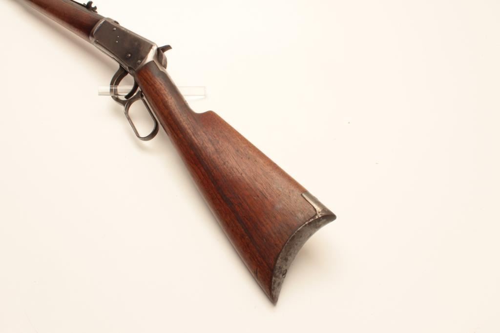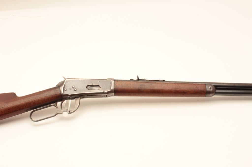 17LP-10 WINCHESTER 1894 #288912Winchester Model 1894 lever action rifle, .38-55 caliber, Serial #258912. The rifle is in very good overall condition with a 26” round barrel with a replacement front sight. The barrel and full-length magazine retainthe majority of their original blue finish with areas of significant loss on the barrel and some light surface rust. The receiver shows significant original blue with edge wear and toning case hardening still visibleon the lever. The smooth wood stocks are in good condition with small mars and compressions from carry and use. The butt stock ends with a smooth steel crescent butt plate with light surface erosion evident.The bore is good, the action is crisp and markings are sharp on this desirable Winchester circa 1902. Est.: $750-$1,500. (C+R).Winchester Model 1894 lever action rifle, .38-55 caliber, Serial #258912. The rifle is in very good overall condition with a 26” round barrel with a replacement front sight. The barrel and full-length magazine retainthe majority of their original blue finish with areas of significant loss on the barrel and some light surface rust. The receiver shows significant original blue with edge wear and toning case hardening still visibleon the lever. The smooth wood stocks are in good condition with small mars and compressions from carry and use. The butt stock ends with a smooth steel crescent butt plate with light surface erosion evident.The bore is good, the action is crisp and markings are sharp on this desirable Winchester circa 1902. Est.: $750-$1,500. (C+R).