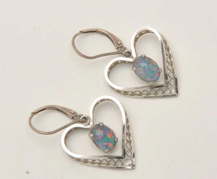 17LP-13 HEART EARRINGSDelicate white gold heart shaped earrings with beautiful opals. The earrings are in good overall condition with a suede display case. Est.: $200-$400.Delicate white gold heart shaped earrings with beautiful opals. The earrings are in good overall condition with a suede display case. Est.: $200-$400.