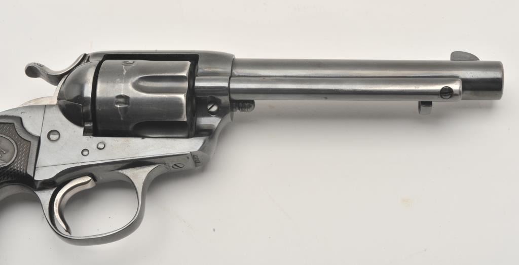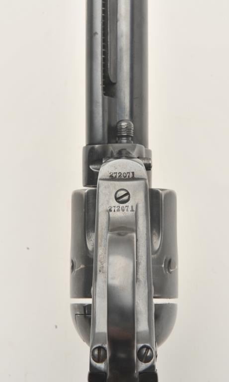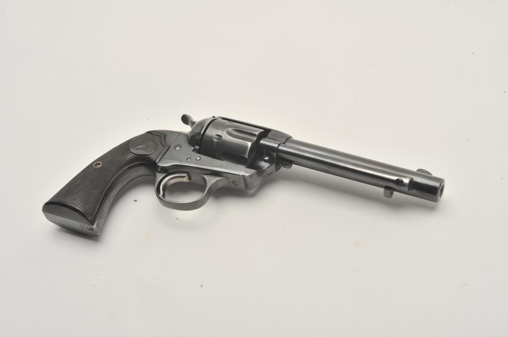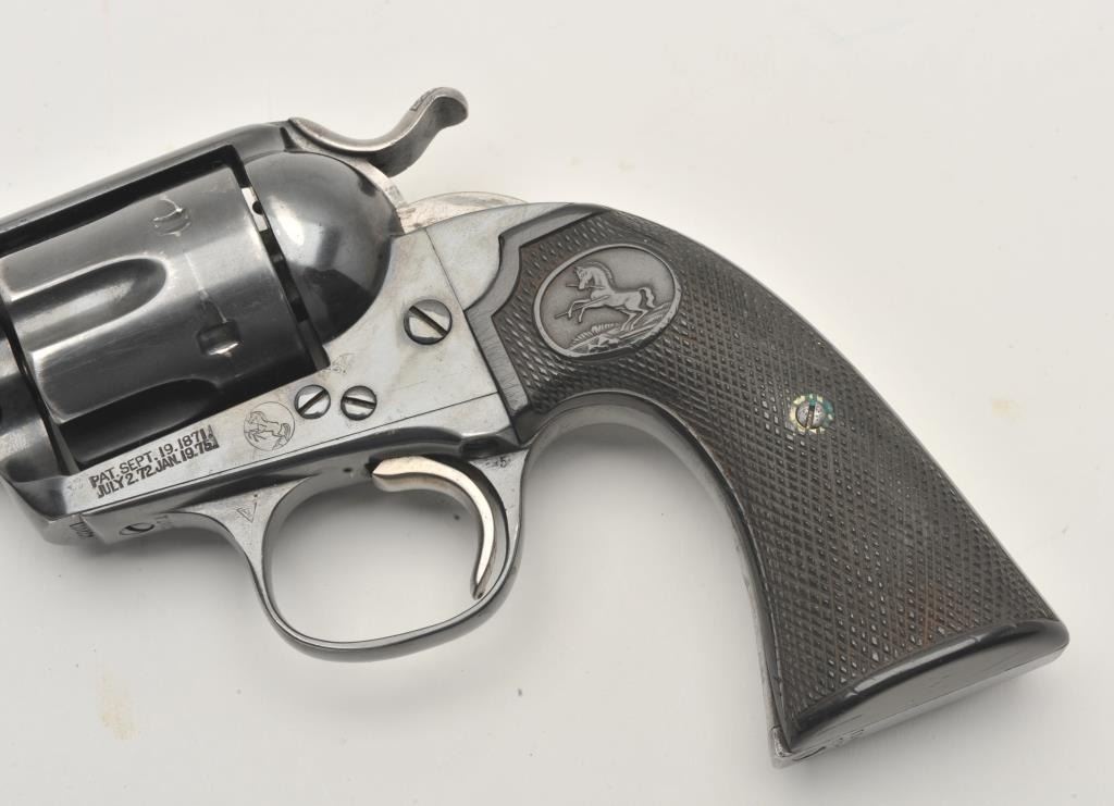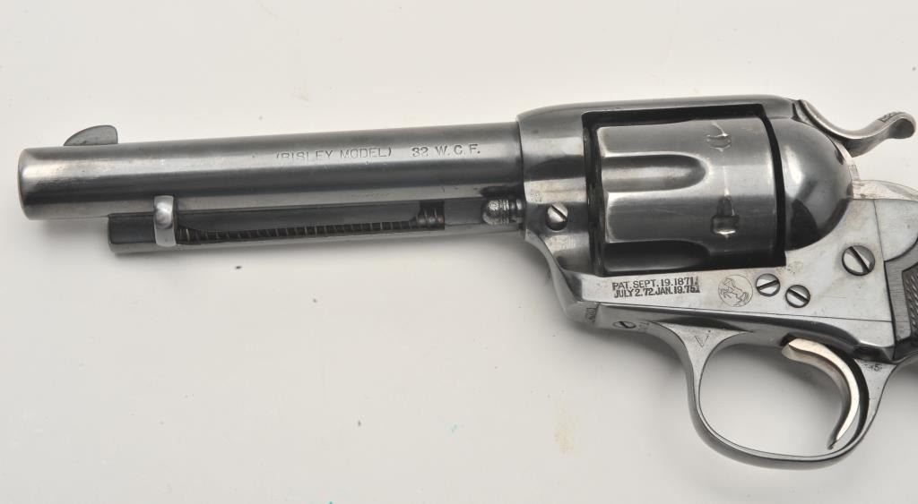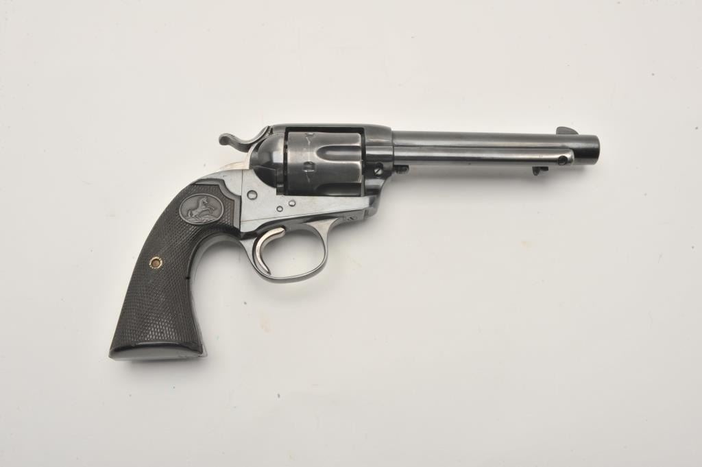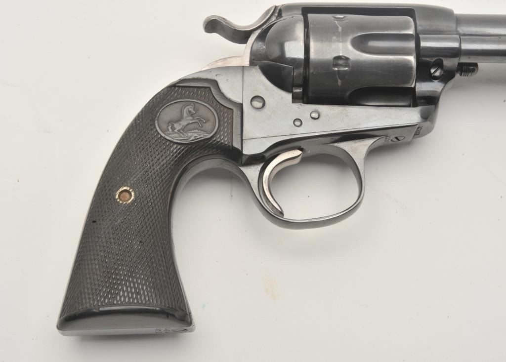 17LP-2 COLT BISLEY #272071Colt Bisley revolver, .32 WCF caliber, Serial #272071. The pistol is in good overall condition as re-finished with a 5 ½” barrel. The pistol retains the majority of an old, quality re-blue with loss of finish at themuzzle and a faint drag line on the cylinder. The hammer shows toned, muted case hardening. The checkered hard rubber grips are in very good condition with sharp checkering. The bore is good, the action iscrisp and markings are legible on this Bisley circa 1905. Est.: $800-$1,600. (C+R).Colt Bisley revolver, .32 WCF caliber, Serial #272071. The pistol is in good overall condition as re-finished with a 5 ½” barrel. The pistol retains the majority of an old, quality re-blue with loss of finish at themuzzle and a faint drag line on the cylinder. The hammer shows toned, muted case hardening. The checkered hard rubber grips are in very good condition with sharp checkering. The bore is good, the action iscrisp and markings are legible on this Bisley circa 1905. Est.: $800-$1,600. (C+R).