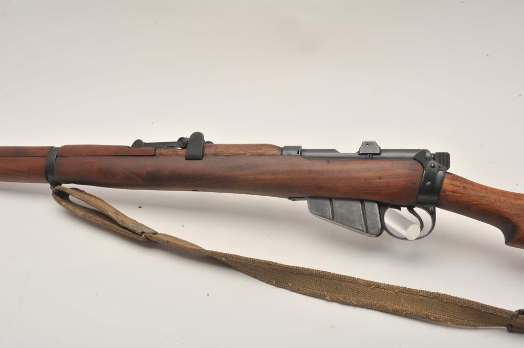 17LY-11 LITHGONE ENFIELDAustralian Lithgow Lee-Enfield No.5 Mk. I bolt action rifle, .303 British caliber, Serial #99235. The rifle is in good overall condition with a 25” barrel with a protected blade front and military tangent style rearsights. The rifle retains the majority of its military finish, with the right rear of the action marked, “AUSTRALIA”. The wrist strap is marked, “LITHGOW SHTLE III” in a shield proof and dated 1922. The rifleretains the bayonet lug, sling swivels and an OD green canvas sling. The smooth wood stock is in very good condition showing only light handling marks. The butt ends with a smooth brass butt plate. The bore is good, theaction is crisp and markings are sharp. A nice example of an Australian “Short Magazine Lee Enfield (SMLE) circa 1922. Est.: $175-$350. (C+R).Australian Lithgow Lee-Enfield No.5 Mk. I bolt action rifle, .303 British caliber, Serial #99235. The rifle is in good overall condition with a 25” barrel with a protected blade front and military tangent style rearsights. The rifle retains the majority of its military finish, with the right rear of the action marked, “AUSTRALIA”. The wrist strap is marked, “LITHGOW SHTLE III” in a shield proof and dated 1922. The rifleretains the bayonet lug, sling swivels and an OD green canvas sling. The smooth wood stock is in very good condition showing only light handling marks. The butt ends with a smooth brass butt plate. The bore is good, theaction is crisp and markings are sharp. A nice example of an Australian “Short Magazine Lee Enfield (SMLE) circa 1922. Est.: $175-$350. (C+R).