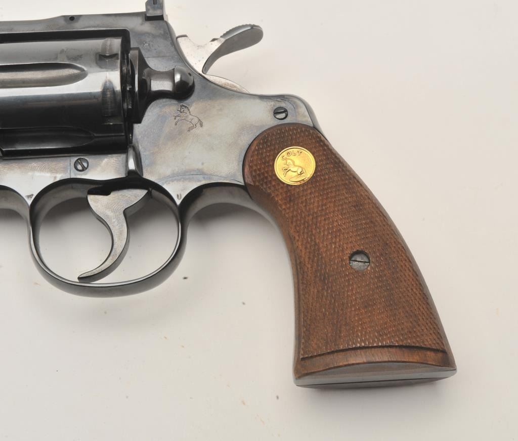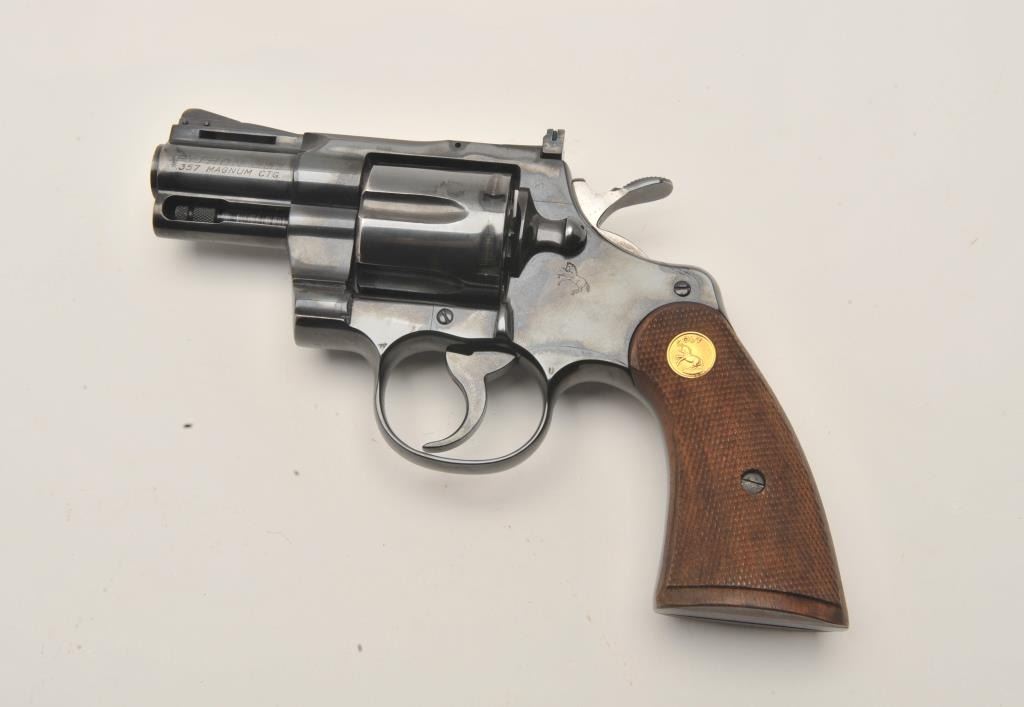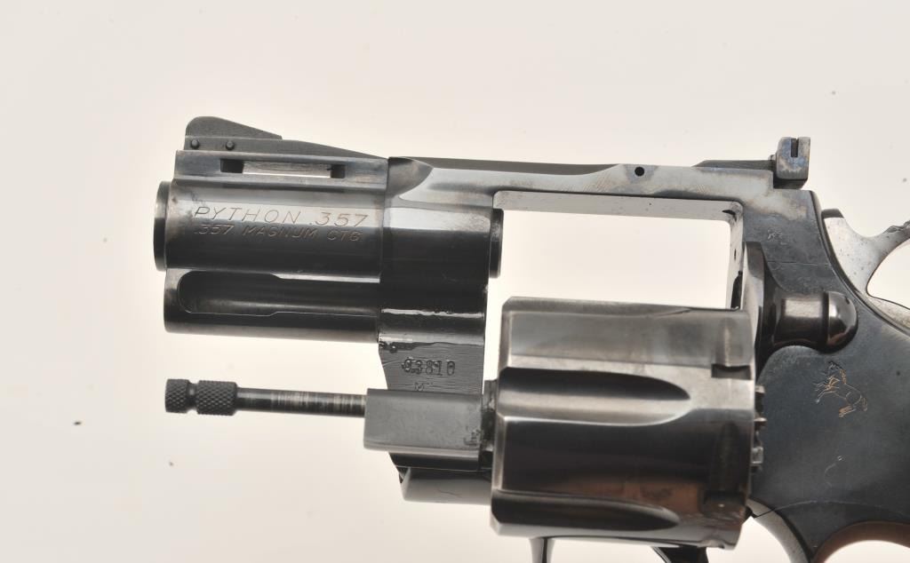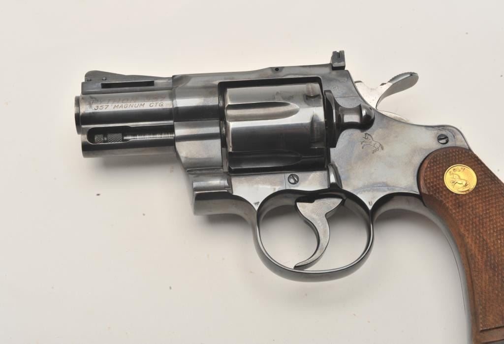 17MB-1 COLT PYTHON #98810Colt Python DA revolver, .357 Magnum caliber, 2.5” ventilated rib barrel, blued finish, checkered wood medallion grips, S/N 93810, in overall fine condition showing majority of original finish with some holster wear tofront of barrel, fine bore, crisp action, sharp markings and fine grips. (C&R/PPT). Est.: $3,000-$5,000.Colt Python DA revolver, .357 Magnum caliber, 2.5” ventilated rib barrel, blued finish, checkered wood medallion grips, S/N 93810, in overall fine condition showing majority of original finish with some holster wear tofront of barrel, fine bore, crisp action, sharp markings and fine grips. (C&R/PPT). Est.: $3,000-$5,000.