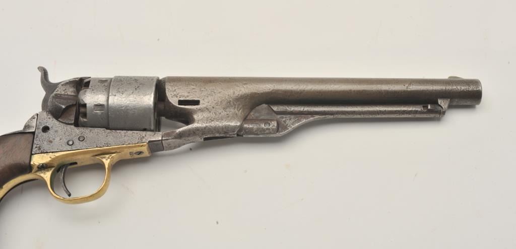 17ME-4 60 ARMY #90272Colt 1860 Army percussion revolver, .44 caliber, Serial #90272. The pistol is in good overall condition with an 8” barrel. The barrel is primarily grey patina with some original blue beneath the loading lever.The barrel has numerous dents, mars and light pitting. The cylinder retains significant cylinder scene with the patent date and serial number still legible. The frame shows some old pin prick pitting and brass trigger guard and iron back strap. The pistol features all matching visible serial numbers and is missing the wedge. The smooth wood grips are missing the base screw but otherwise are in good overall condition withmars and scrapes consistent with use. The action is functioning at the time of description, the bore is fair and markings are legible. Est.: $800-$1,600. (Antique).Colt 1860 Army percussion revolver, .44 caliber, Serial #90272. The pistol is in good overall condition with an 8” barrel. The barrel is primarily grey patina with some original blue beneath the loading lever.The barrel has numerous dents, mars and light pitting. The cylinder retains significant cylinder scene with the patent date and serial number still legible. The frame shows some old pin prick pitting and brass trigger guard and iron back strap. The pistol features all matching visible serial numbers and is missing the wedge. The smooth wood grips are missing the base screw but otherwise are in good overall condition withmars and scrapes consistent with use. The action is functioning at the time of description, the bore is fair and markings are legible. Est.: $800-$1,600. (Antique).