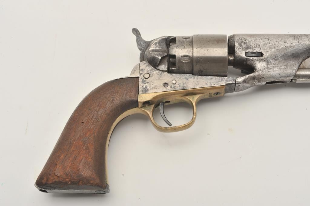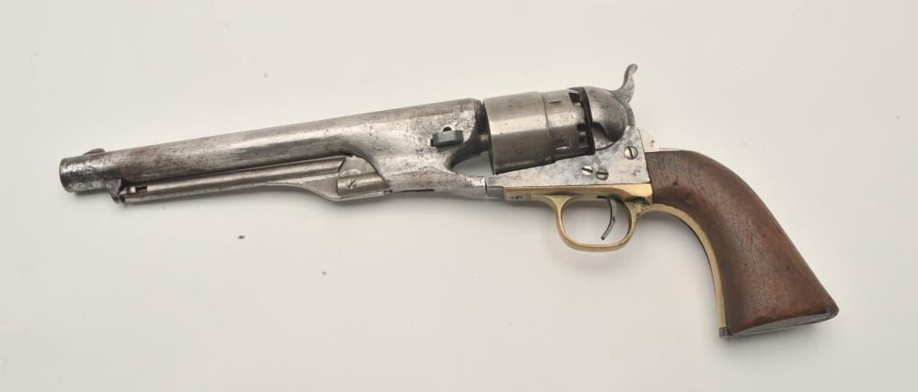 17ME-5 60 ARMY #118941Colt 1860 Army percussion revolver, .44 caliber, Serial #118941. The pistol is in fair overall condition with an 8” barrel. The pistol has been polished clean with the barrel a bright silver patina and barreladdress still visible. The barrel has numerous dents, mars and light pitting. The cylinder has been polished smooth with no visible cylinder scene. The frame shows some old pin prick pitting, with brass triggerguard and iron back strap. The bottom of the pistol has matching visible serial numbers except the butt and wedge. The smooth wood grips are in good overall condition with mars and scrapes consistent with use. The action is not functioning at the time of description, the bore is fair and markings are legible. Est.: $800-$1,600. (Antique).Colt 1860 Army percussion revolver, .44 caliber, Serial #118941. The pistol is in fair overall condition with an 8” barrel. The pistol has been polished clean with the barrel a bright silver patina and barreladdress still visible. The barrel has numerous dents, mars and light pitting. The cylinder has been polished smooth with no visible cylinder scene. The frame shows some old pin prick pitting, with brass triggerguard and iron back strap. The bottom of the pistol has matching visible serial numbers except the butt and wedge. The smooth wood grips are in good overall condition with mars and scrapes consistent with use. The action is not functioning at the time of description, the bore is fair and markings are legible. Est.: $800-$1,600. (Antique).