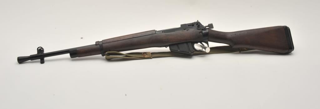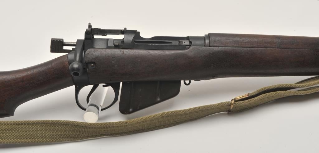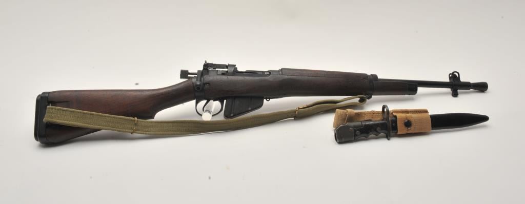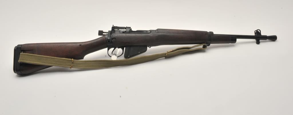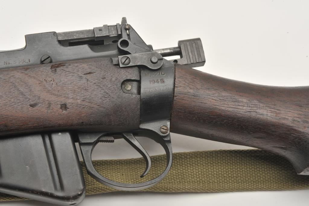 17MH-22 ENFIELD NO5 #BG9919British Enfield No. 5 MK I bolt action carbine with bayonet, sheath and woven hanger, .303 caliber, military finish, wood stock, woven sling, S/N BG9919, overall good to very good condition with very good bore,crisp action and markings, very good wood stock. (C&R/PPT). Est.: $300-$600.British Enfield No. 5 MK I bolt action carbine with bayonet, sheath and woven hanger, .303 caliber, military finish, wood stock, woven sling, S/N BG9919, overall good to very good condition with very good bore,crisp action and markings, very good wood stock. (C&R/PPT). Est.: $300-$600.