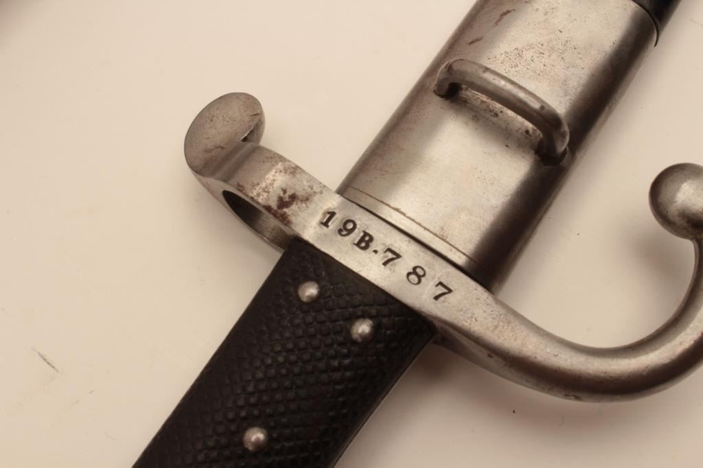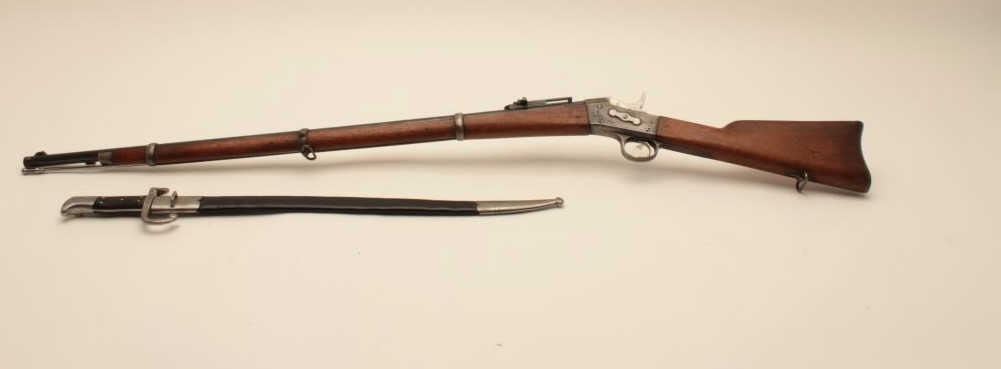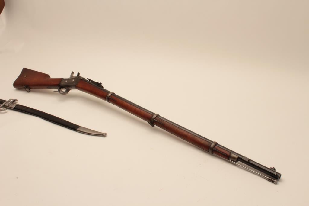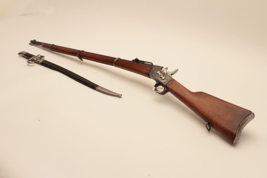 17MJ-9 DANISH REM. ROLLING BLOCKDanish Remington Rolling Block rifle, 11mm caliber, 35” barrel, blued and case hardened finish, wood stock, in overall good to very good condition with a bayonet and sheath; very good bore, crisp action, very goodmarkings and muted blued finish to barrel with areas of muted case colors on receiver. (Antique). Est.: $400-$800.Danish Remington Rolling Block rifle, 11mm caliber, 35” barrel, blued and case hardened finish, wood stock, in overall good to very good condition with a bayonet and sheath; very good bore, crisp action, very goodmarkings and muted blued finish to barrel with areas of muted case colors on receiver. (Antique). Est.: $400-$800.