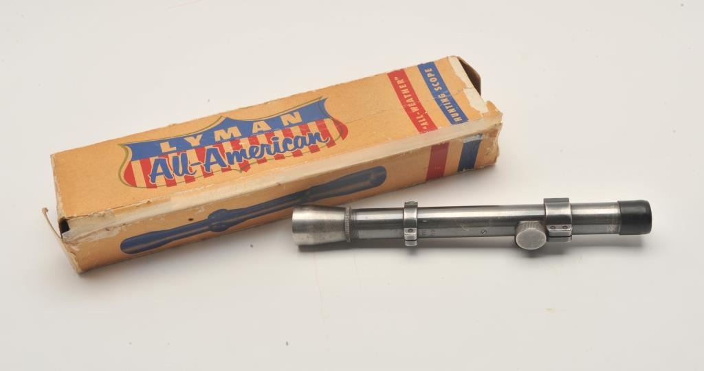 17ML-5 LYMAN "ALL AMERICAN" 4X SCOPER. Noske 2 ½ X fixed power rifle scope. The scope is in good overall condition with consistent wear over the length of the tube. The scope is 9 3/8” in length and features a fine crosshair and dot reticle. The scopecomes in a Lyman All-American box with brochure. A set of rings remain on the scope. Est.: $100-$200.R. Noske 2 ½ X fixed power rifle scope. The scope is in good overall condition with consistent wear over the length of the tube. The scope is 9 3/8” in length and features a fine crosshair and dot reticle. The scopecomes in a Lyman All-American box with brochure. A set of rings remain on the scope. Est.: $100-$200.