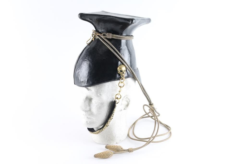 Very rare Lancers Foul Weather Lance Cap, four sided peak, light weight tarred black leather covered helmet having gilt metal skull side bosses holding leather backed linked gilt scaled brass chin chain, lined with black velvet, velvet appears to be a replacement. Leather covered dome fitting to represent the rosette on left side. Interior has the leather sweatband and intact red silk lining showing some age wear. Interior of crown marked in gold "Carter & Co. 56 Pall Mall, London, Established 1776". The 17th Lancers were the only regiment to have their own regimental bosses to the sides of the foul weather lance cap, all other regiments adopted the lion headed boss. Comes with correct gold toned double cord with two acorns, there is a 1 1/2" repair to one of the cords. Overall Very Good condition. From the Joe Musso Collection.