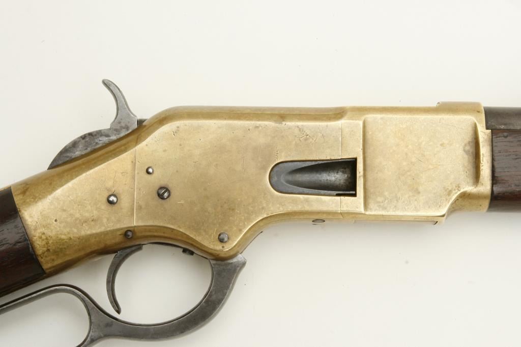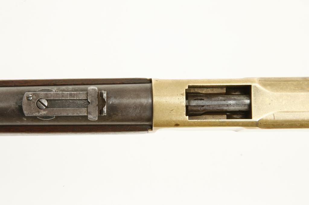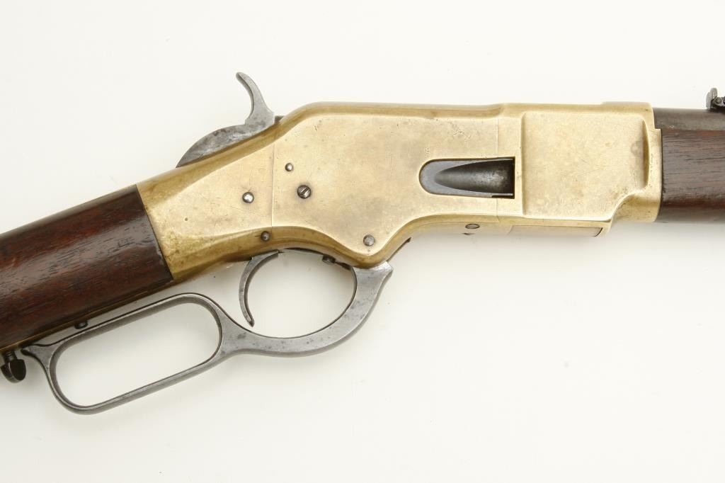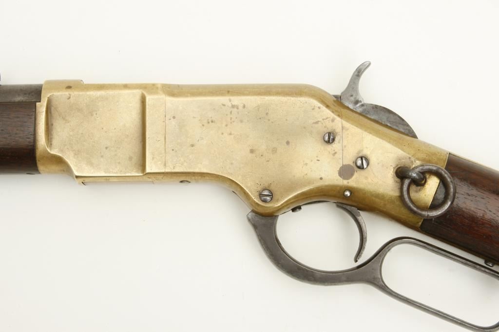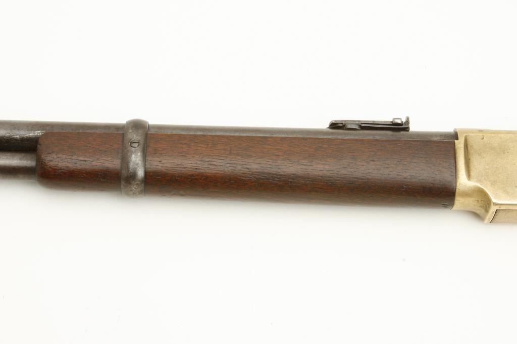 1866 Winchester carbine in .44 rimfire caliber, S/N 162767. In very good plus original condition showing strong traces of blue mixing with a natural patina. Original small parts, bands and springs. Very crispframe with light patina and tight side plates showing only slight aging. Most original bright blue on the loading gate. Very good plus to almost fine stocks with just slight and minor imperfections and age. A far aboveaverage late 1866 carbine in the era when 73 sights and butt plates were interchangeable on both models. (Antique) Est.: $10,000-$20,000