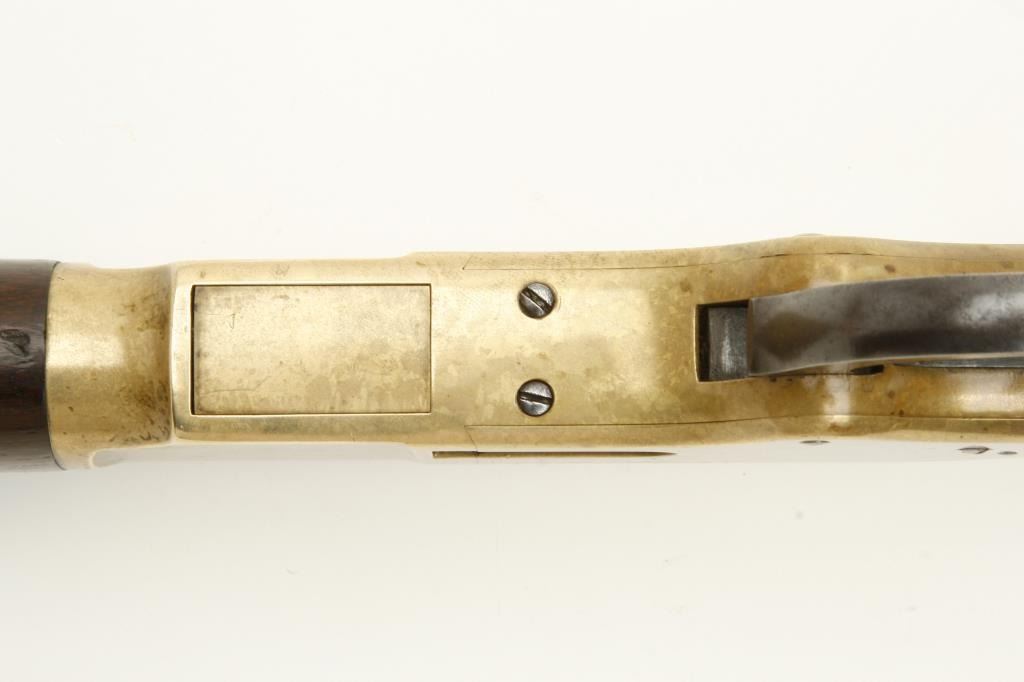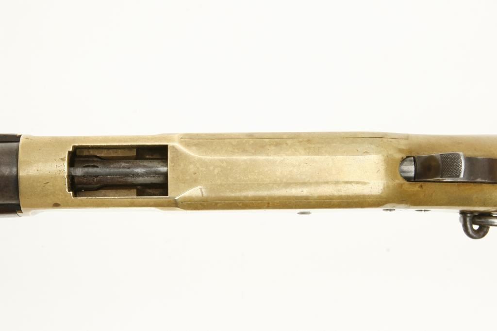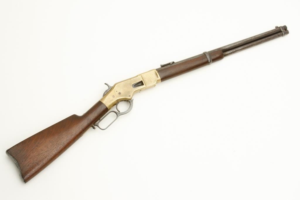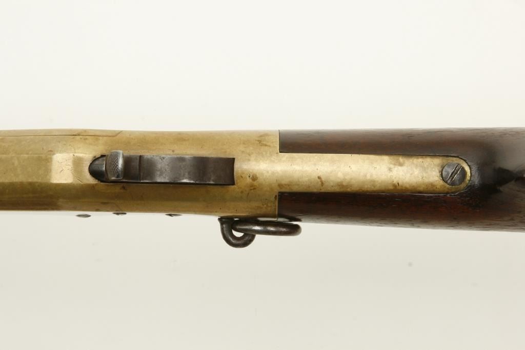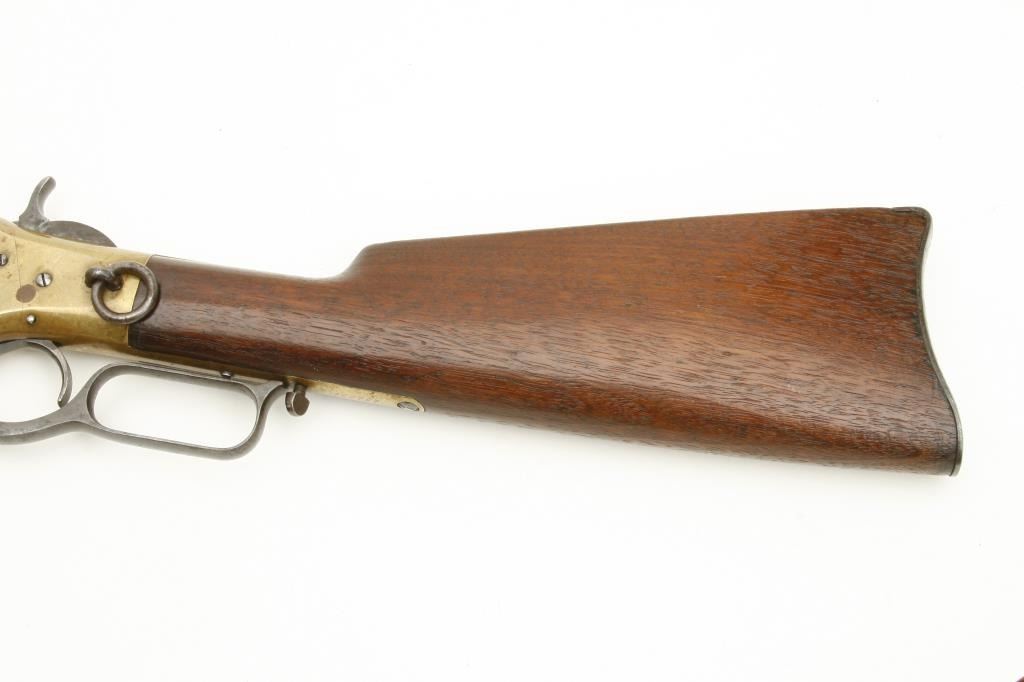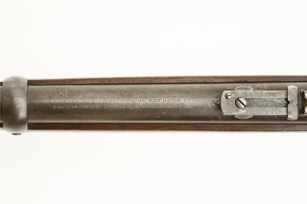1866 Winchester carbine in .44 rimfire caliber, S/N 162767. In very good plus original condition showing strong traces of blue mixing with a natural patina. Original small parts, bands and springs. Very crispframe with light patina and tight side plates showing only slight aging. Most original bright blue on the loading gate. Very good plus to almost fine stocks with just slight and minor imperfections and age. A far aboveaverage late 1866 carbine in the era when 73 sights and butt plates were interchangeable on both models. (Antique) Est.: $10,000-$20,000