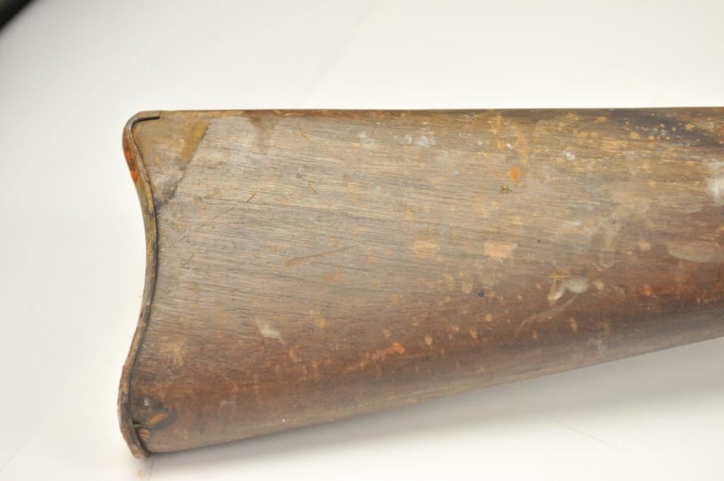 1873 Springfield trapdoor rifle, .45-70 caliber, Serial #NSNV. The rifle is water damaged and rusted, needing restoration. The rifle is sold as is, where is, with no warranty made or implied. The rifle appearscomplete with a 32” barrel. Est.: $150-$300. (Antique).