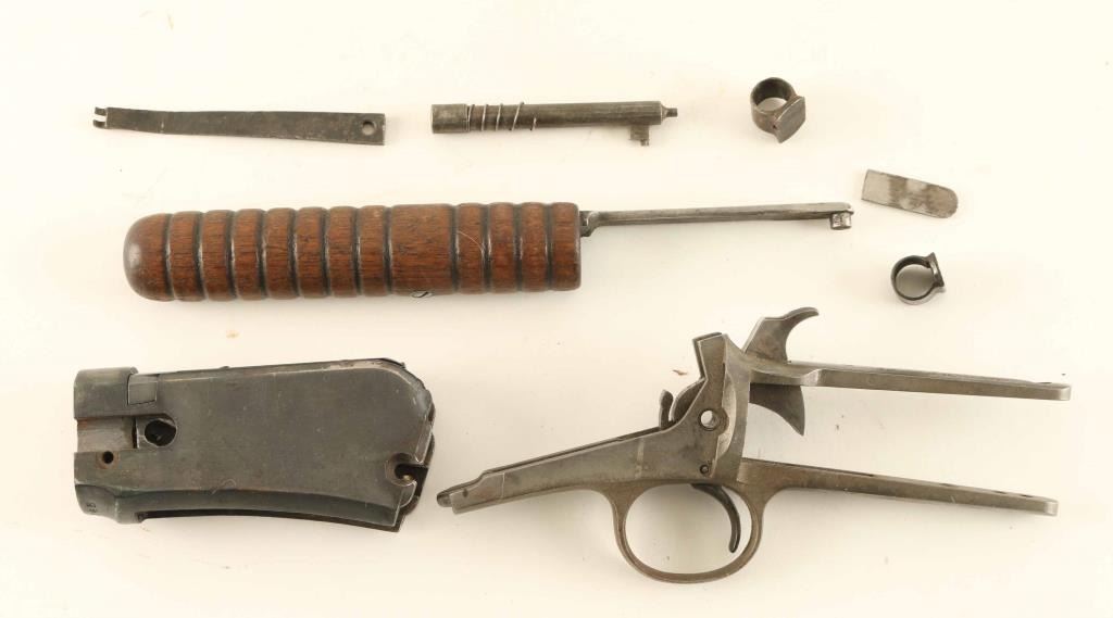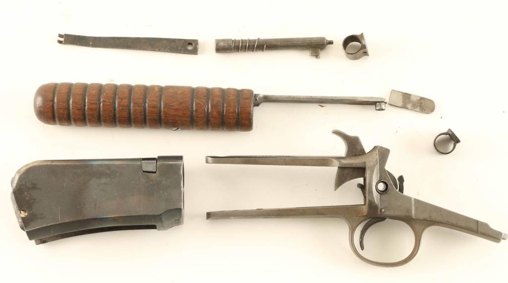FAIR: Some major parts replaced; minor replacement parts may be required; metal rusted, may be lightly pitted all over, vigorously cleaned or re-blued; rounded edges of metal and wood; principal lettering, numerals and design on metal partly obliterated; wood scratched, bruised, cracked or repaired where broken; in fair working order or can be easily repaired and placed in working order.