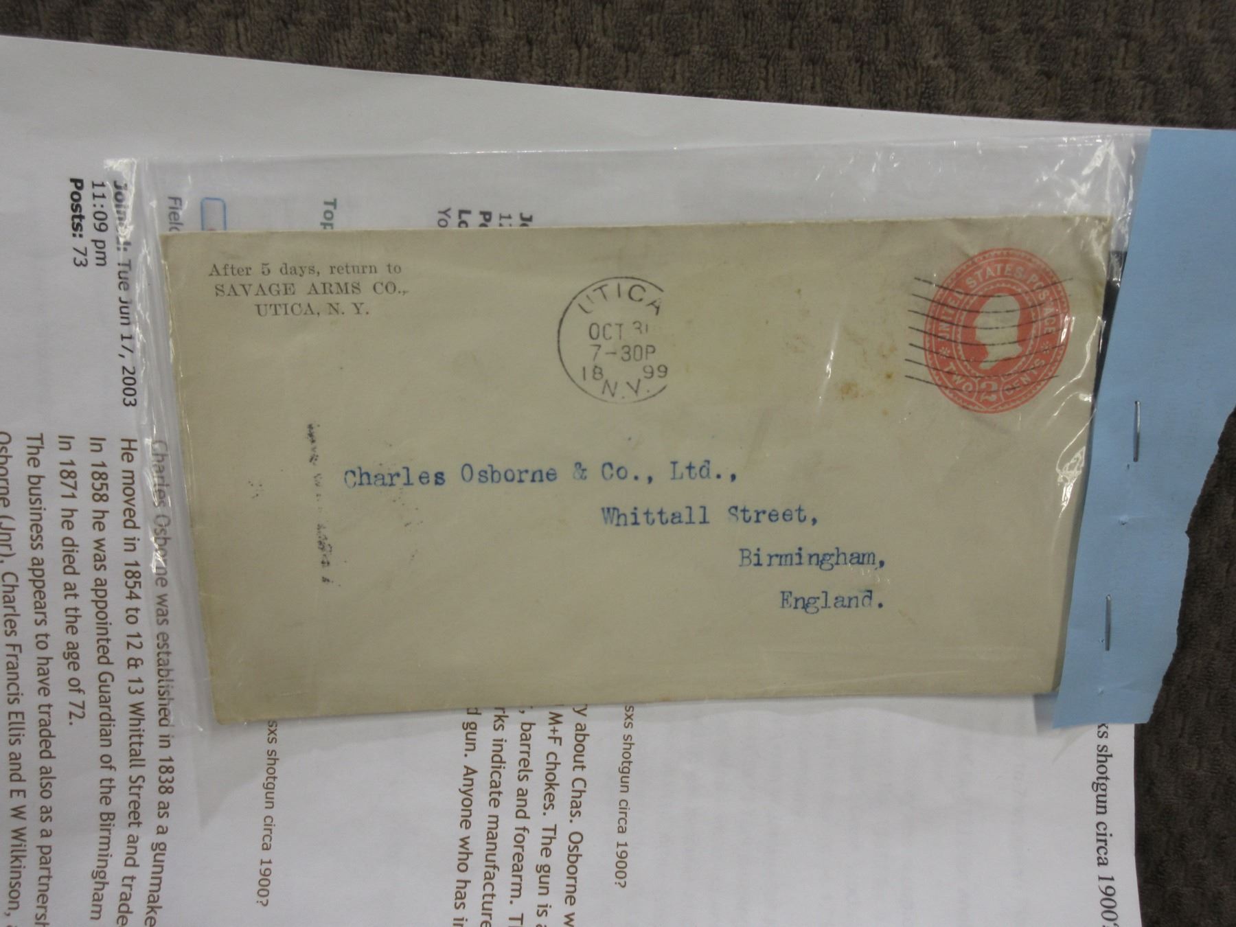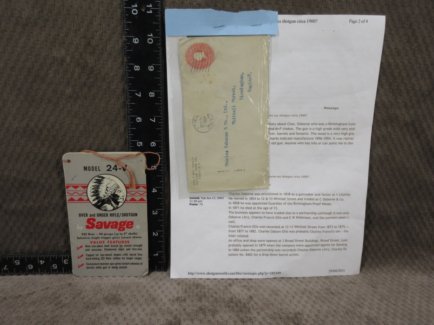1899 Savage Arms Envelope & Letter to Charles Osborne & Co. + Savage Model 24-V Hang Tag