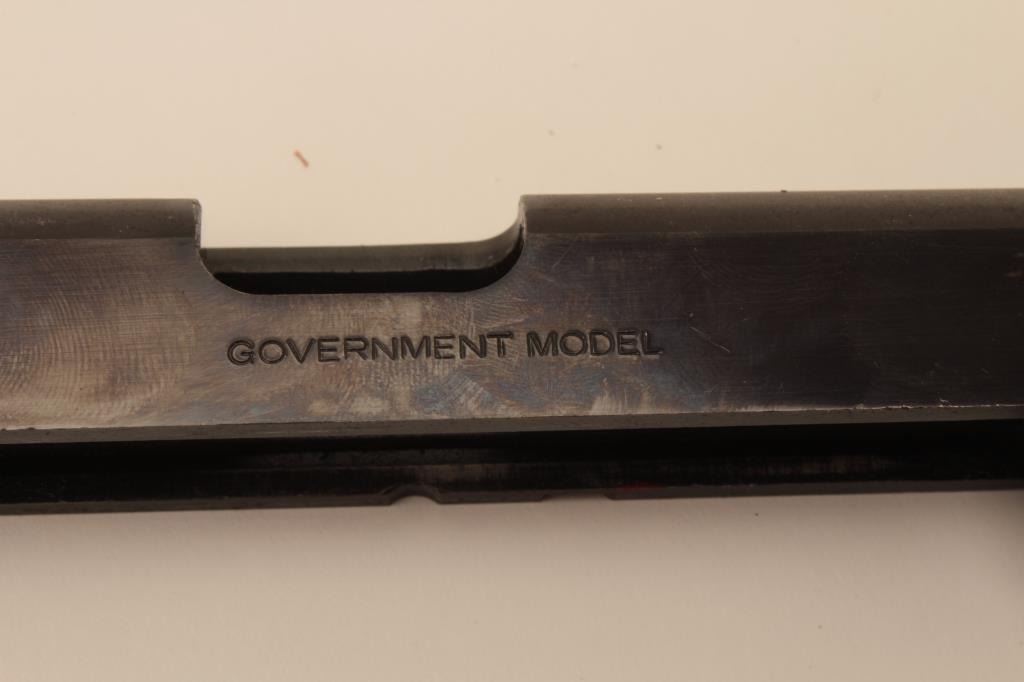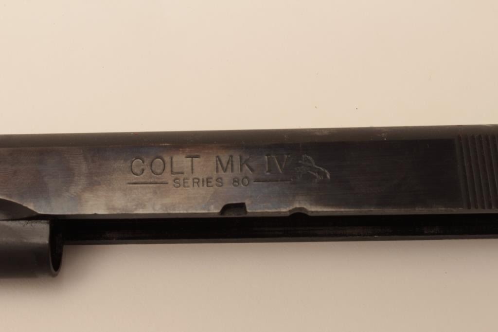 18A0-7 COLT MK IV SERIES 80 SLIDEColt Mark IV Series 80 blued slide. The lot consists of one blued slide in very good condition with the front and rear sights removed. The slide retains nearly all of its original finish. Est.: $100-$200.Colt Mark IV Series 80 blued slide. The lot consists of one blued slide in very good condition with the front and rear sights removed. The slide retains nearly all of its original finish. Est.: $100-$200.