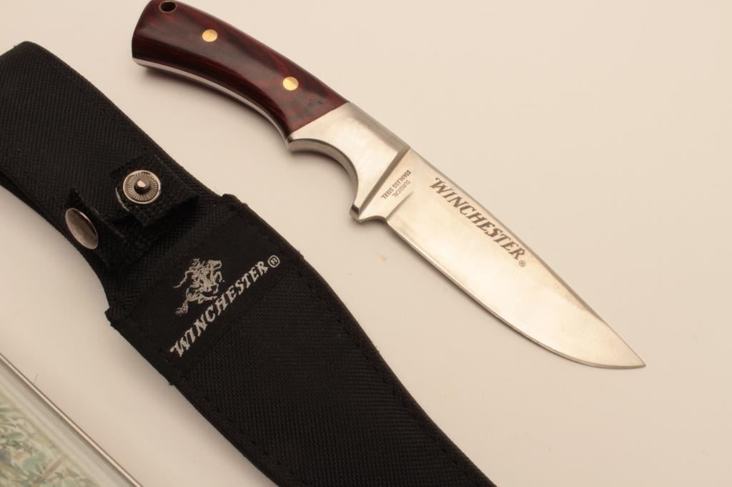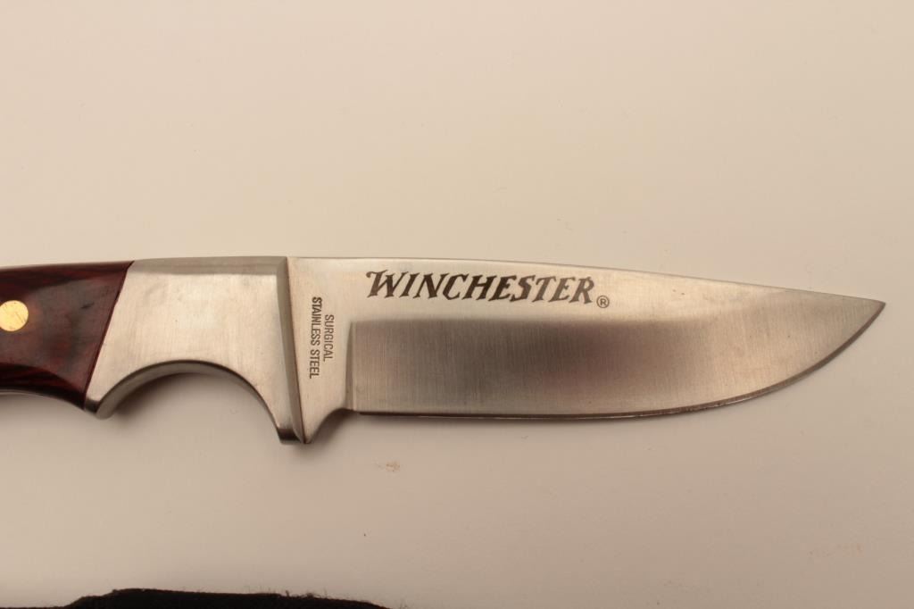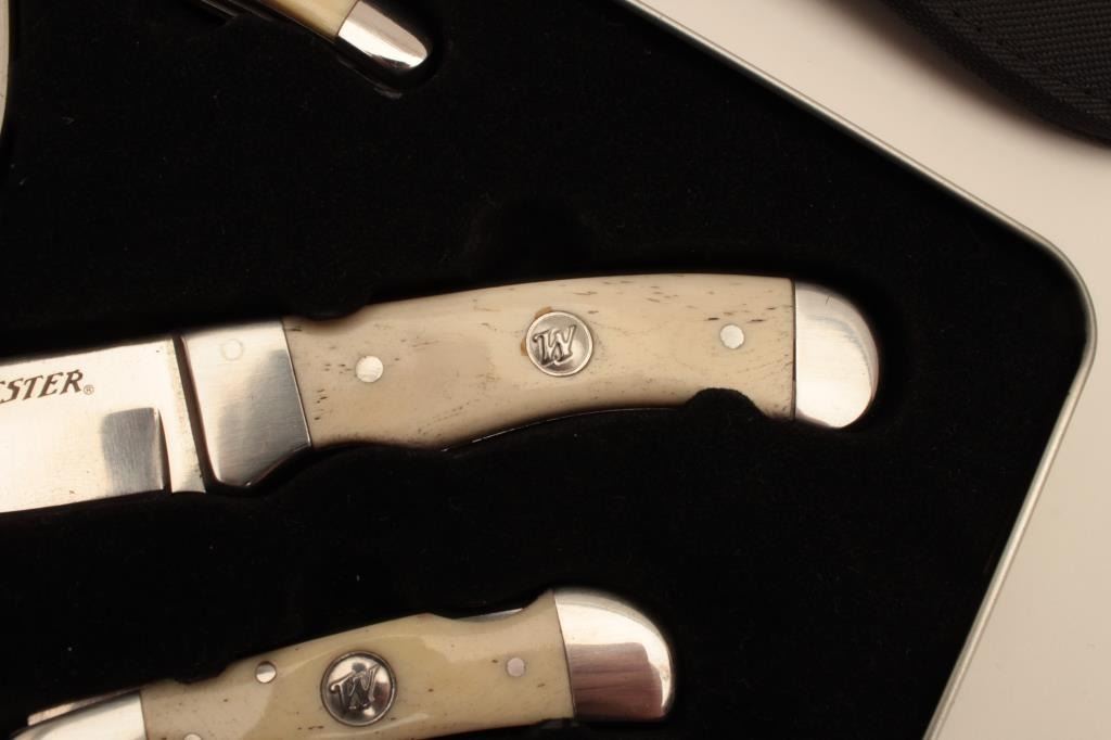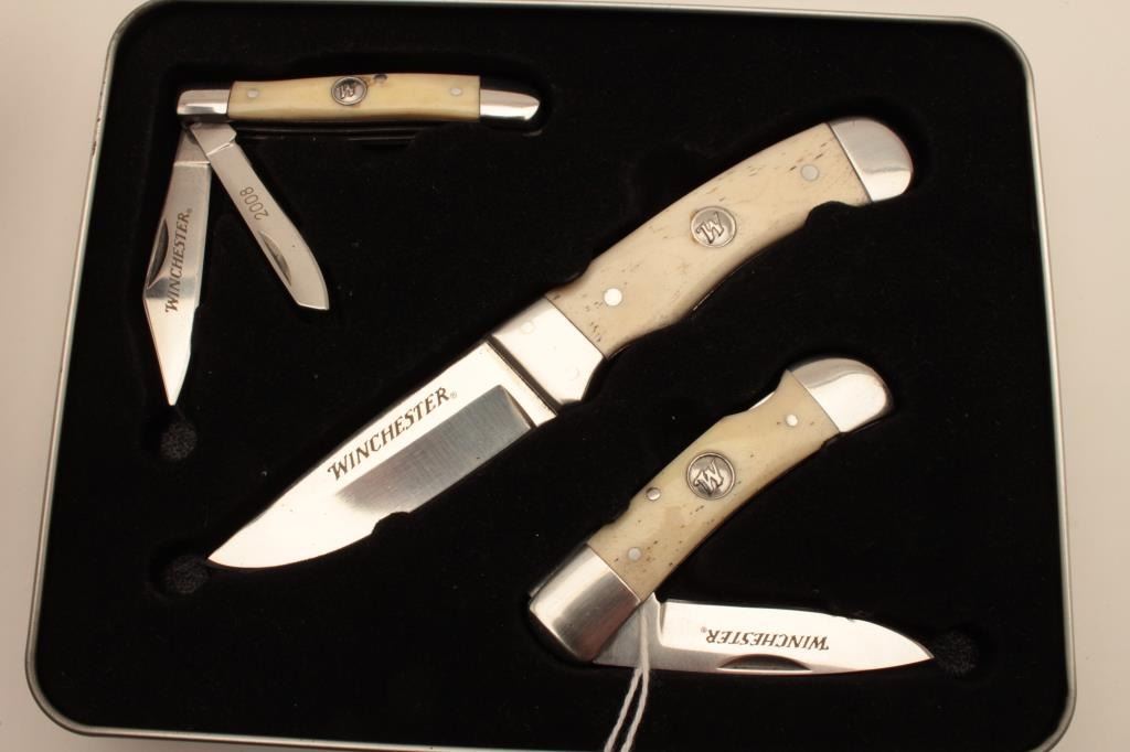 18AG-4 WINCHESTER KNIVESLot of Winchester knives including a sheath knife and set of three bone handled knives in a decorative tin. The first is a Winchester marked belt knife with a 4” blade marked, “SURGICAL STAINLESS STEEL”, featuring a hardwood handle and nylon sheath. The second, a 2008 special edition set of three bone handled knives including two folders and one fixed blade. All three are in excellent condition and come in a Winchester tin with a decorative reproduction of an old advertisement on the lid. Est.: $100-$200.Lot of Winchester knives including a sheath knife and set of three bone handled knives in a decorative tin. The first is a Winchester marked belt knife with a 4” blade marked, “SURGICAL STAINLESS STEEL”, featuring a hardwood handle and nylon sheath. The second, a 2008 special edition set of three bone handled knives including two folders and one fixed blade. All three are in excellent condition and come in a Winchester tin with a decorative reproduction of an old advertisement on the lid. Est.: $100-$200.