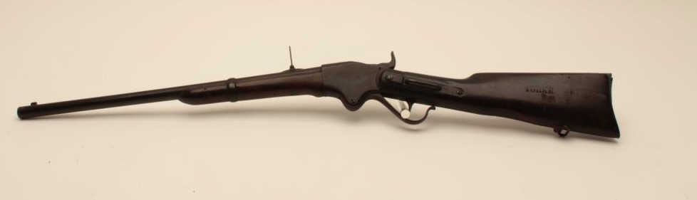18AH-1 SPENCER CARBINE #36935Spencer Model 1860 Saddle Ring Carbine, .56 caliber, Serial #36935. The carbine is in good overall condition with a 22” barrel with a silver blade front and military tangent rear sight. The barrel and receiver havegone to a heavy dark brown patina with light surface erosion noted. The action retains the original saddle ring bar and has a replacement washer added to the hammer. The smooth wood stock has seen considerable wearwith mars, dents and compressions consistent with service use. The butt stock has a sling swivel, an old cartouche on both sides of the butt that appears to read, “YORKE” and ends with a smooth steel butt plate.According to the consignor, this Civil War era Spencer descended through the Cartwright Family of Sunflower County, Mississippi and was in the personal collection of Sheriff Cartwright. The bore is fair, the actionfunctions and the markings are legible on this Civil War era Spencer which may be researchable. Est.: $800-$1,600. (Antique).Spencer Model 1860 Saddle Ring Carbine, .56 caliber, Serial #36935. The carbine is in good overall condition with a 22” barrel with a silver blade front and military tangent rear sight. The barrel and receiver havegone to a heavy dark brown patina with light surface erosion noted. The action retains the original saddle ring bar and has a replacement washer added to the hammer. The smooth wood stock has seen considerable wearwith mars, dents and compressions consistent with service use. The butt stock has a sling swivel, an old cartouche on both sides of the butt that appears to read, “YORKE” and ends with a smooth steel butt plate.According to the consignor, this Civil War era Spencer descended through the Cartwright Family of Sunflower County, Mississippi and was in the personal collection of Sheriff Cartwright. The bore is fair, the actionfunctions and the markings are legible on this Civil War era Spencer which may be researchable. Est.: $800-$1,600. (Antique).