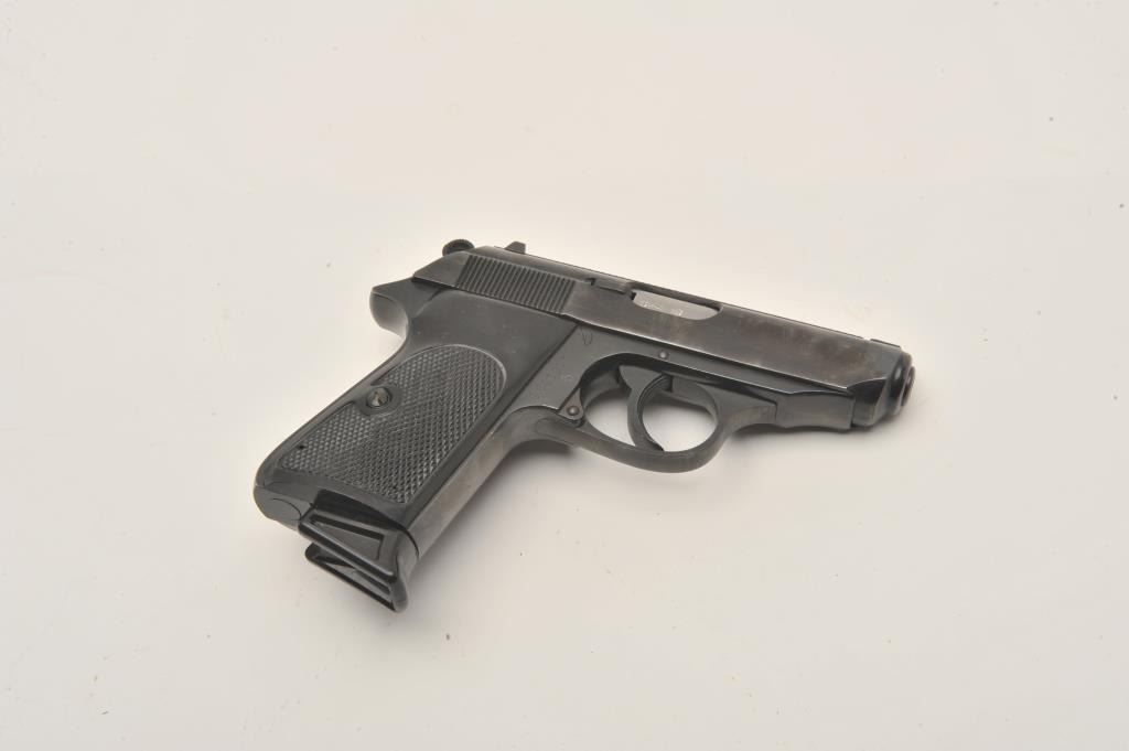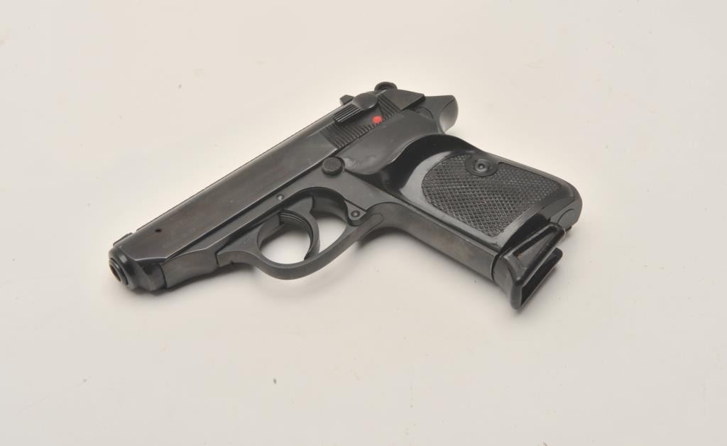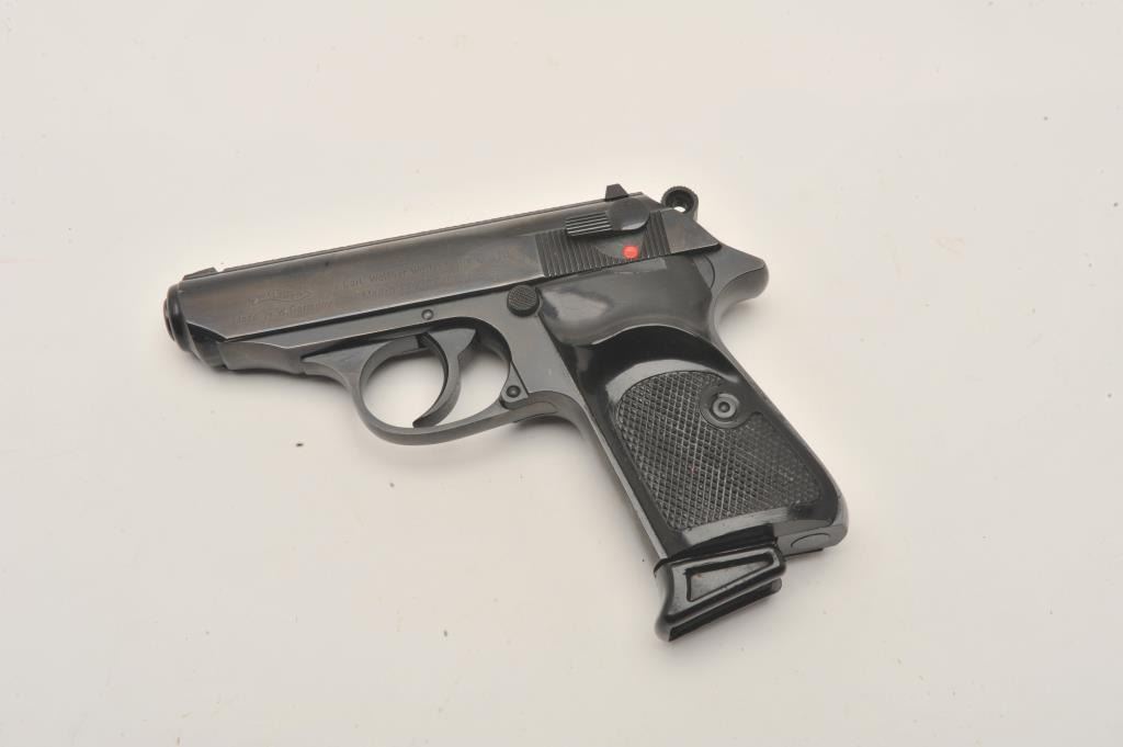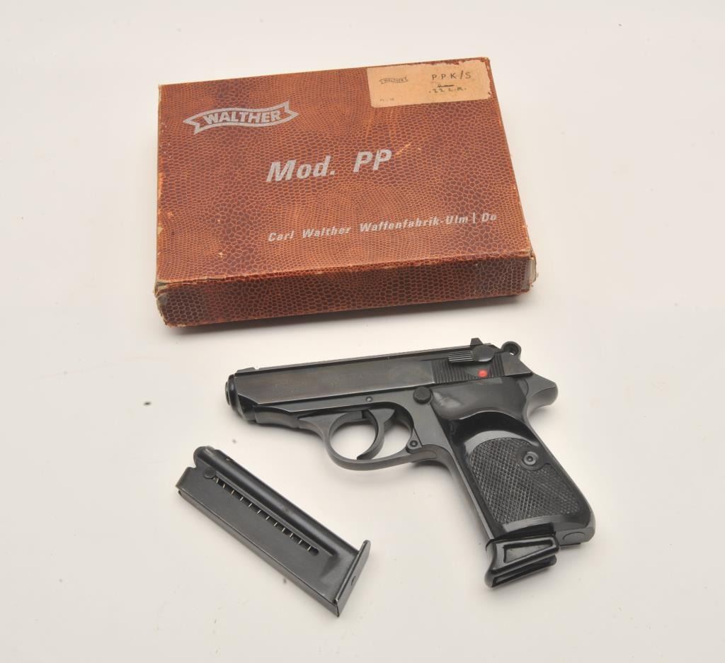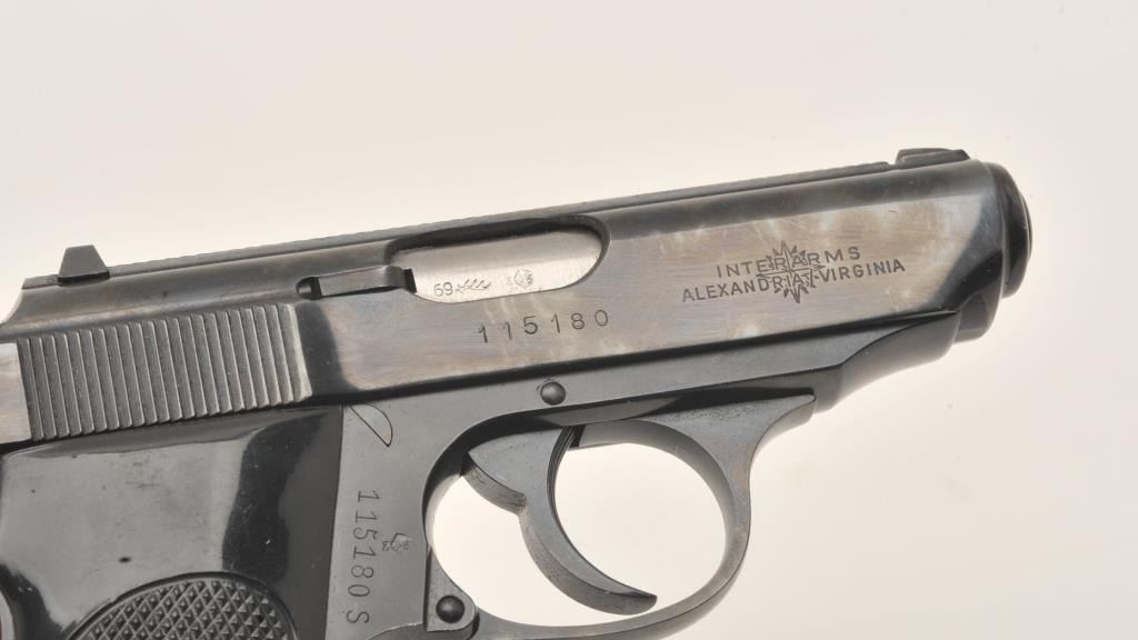 18AJ-2 NPPK-S-22 #115180Walther Model PPK/S DA semi-automatic pistol, .22LR caliber, blued finish, checkered black grips, S/N 115180, Interarms marked with one extra magazine, instructions and two piece brown cardboard factory box. Gun is inoverall fine condition with majority of original finish, fine bore, crisp action, sharp markings and fine grips. (Modern/PPT). Est.: $700-$1,400.Walther Model PPK/S DA semi-automatic pistol, .22LR caliber, blued finish, checkered black grips, S/N 115180, Interarms marked with one extra magazine, instructions and two piece brown cardboard factory box. Gun is inoverall fine condition with majority of original finish, fine bore, crisp action, sharp markings and fine grips. (Modern/PPT). Est.: $700-$1,400.