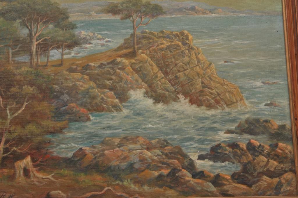 18AK-2 ORIGINAL OIL L.L. ANDREAS ROTHOriginal oil on canvas identified as Carmel, Midway Point signed lower left Andreas Roth, 1946. Measures approximately 18 ¾” x 25 ¾”. Period frame. Good as found in estate condition. Needs cleaning, re-varnishing, and minor conservation. No major damage. A quality artwork of popular area that’s well identified. Andreas Roth was born 1872 and died 1949. Noted landscape painter born in Bavaria. He was located in California in 1931 and is listed as a pre-war California artist. Exhibited at Orange Co. museum in his lifetime. Est.: $600-$1200Original oil on canvas identified as Carmel, Midway Point signed lower left Andreas Roth, 1946. Measures approximately 18 ¾” x 25 ¾”. Period frame. Good as found in estate condition. Needs cleaning, re-varnishing, and minor conservation. No major damage. A quality artwork of popular area that’s well identified. Andreas Roth was born 1872 and died 1949. Noted landscape painter born in Bavaria. He was located in California in 1931 and is listed as a pre-war California artist. Exhibited at Orange Co. museum in his lifetime. Est.: $600-$1200