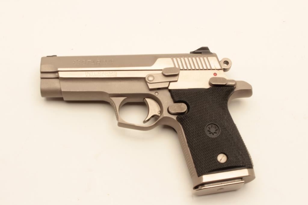 18AL-58 STAR #2079882Star Interarms Firestar Model semi-automatic pistol, 9mm caliber, stainless, checkered hard rubber grips, one extra magazine, S/N 2079882, in overall fine condition with a fine bore, crisp action, sharp markings andfine grips. (Modern/PPT). Est.: $250-$500.Star Interarms Firestar Model semi-automatic pistol, 9mm caliber, stainless, checkered hard rubber grips, one extra magazine, S/N 2079882, in overall fine condition with a fine bore, crisp action, sharp markings andfine grips. (Modern/PPT). Est.: $250-$500.