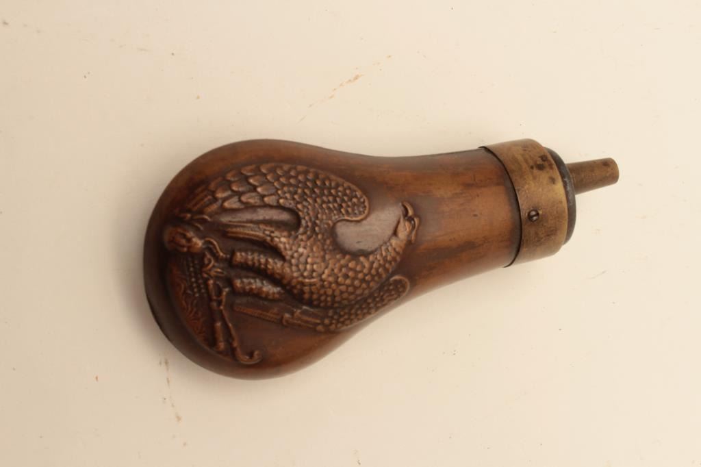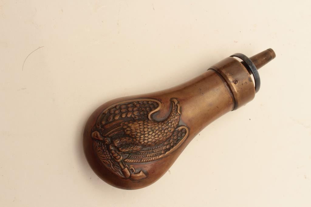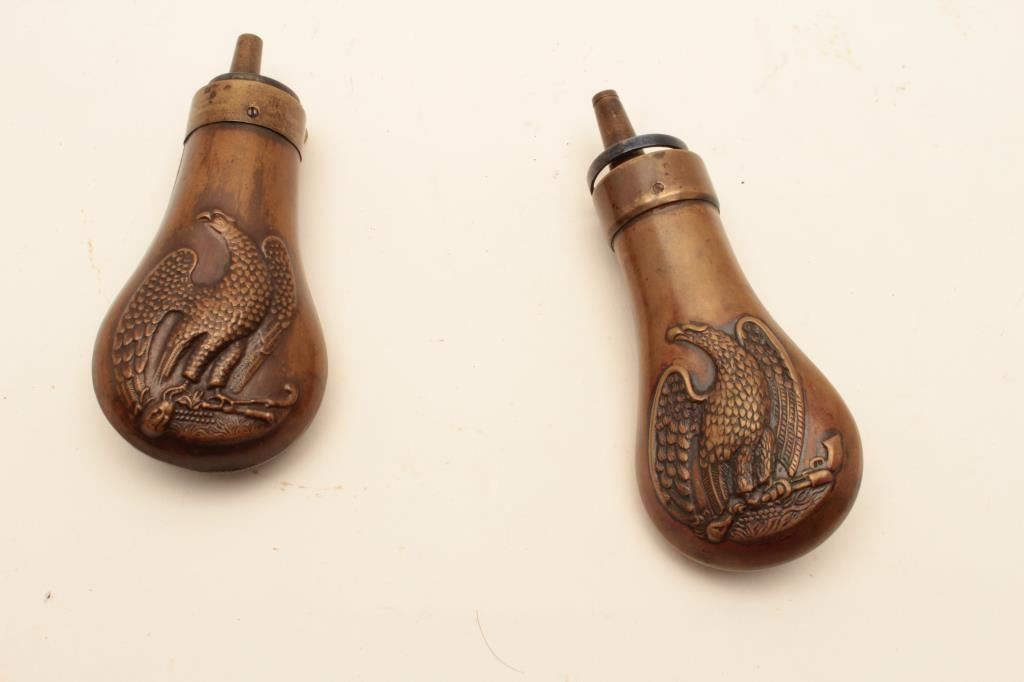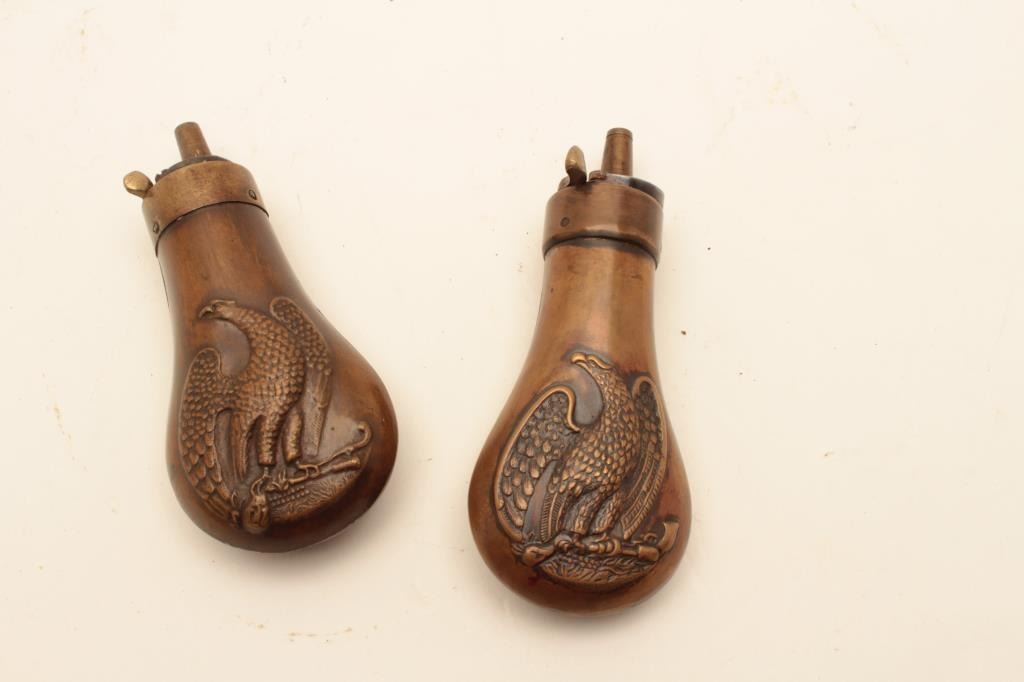 18AL-69 TWO POCKET FLASKSLot of 2 brass eagle motif powder flask for Colt Model 1849 Pocket percussion revolvers; nice patina on both. Est.: $300-$600.Lot of 2 brass eagle motif powder flask for Colt Model 1849 Pocket percussion revolvers; nice patina on both. Est.: $300-$600.