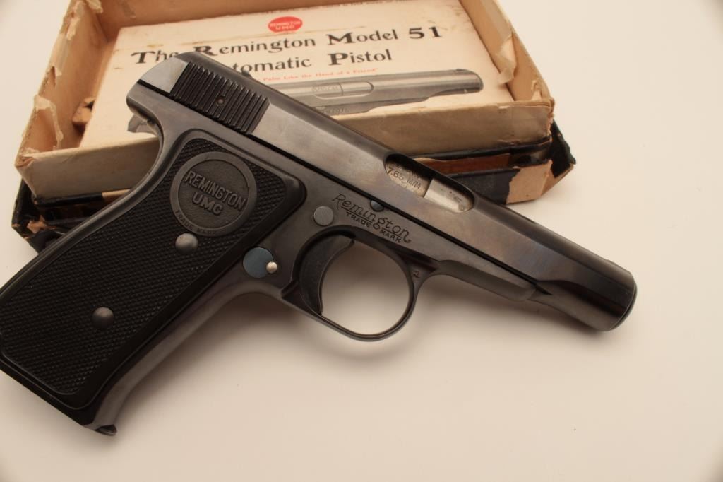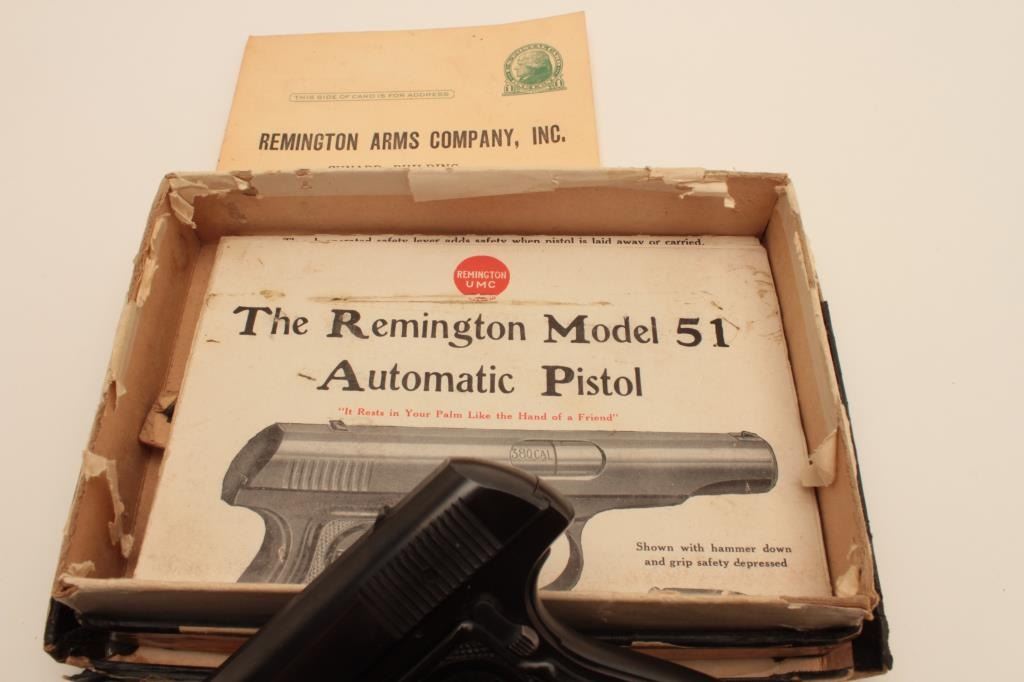 18AN-1 REMINGTON MDL 51 #PA64627Remington Model 51 Semi-Auto pistol in original box in scarce .32 ACP caliber, S/N PA64627. 98%-99% plus condition and original near mint. The box contains instructions and advertising. The box is fair only needingrestoration. (C&R/No PPT) Est.: $1500-$3000Remington Model 51 Semi-Auto pistol in original box in scarce .32 ACP caliber, S/N PA64627. 98%-99% plus condition and original near mint. The box contains instructions and advertising. The box is fair only needingrestoration. (C&R/No PPT) Est.: $1500-$3000