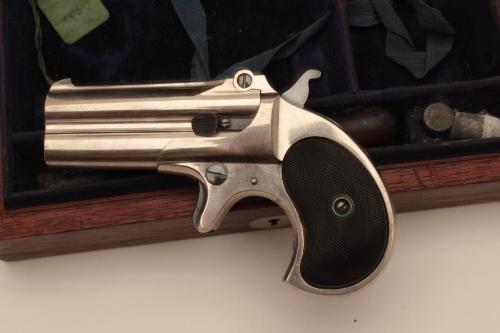 18AN-10 REMINGTON O/U DERRINGERRemington .41 caliber O/U derringer with one line address “Remington Arms Co. Ilion. N.Y.”, S/N 740. 98%-99% plus original nickel with bright fire blue on small parts and screws. Excellent grips. Fine to excellentoverall. Shows no use. 3 Indian letters engraved on the back strap and lid of the case. The case is a partition style with room for cartridges or cartridge block along with accessories. The box is of the correct eraas is the lining. Good to very good condition as to interior. (Antique) Est.: $1250-$2500Remington .41 caliber O/U derringer with one line address “Remington Arms Co. Ilion. N.Y.”, S/N 740. 98%-99% plus original nickel with bright fire blue on small parts and screws. Excellent grips. Fine to excellentoverall. Shows no use. 3 Indian letters engraved on the back strap and lid of the case. The case is a partition style with room for cartridges or cartridge block along with accessories. The box is of the correct eraas is the lining. Good to very good condition as to interior. (Antique) Est.: $1250-$2500