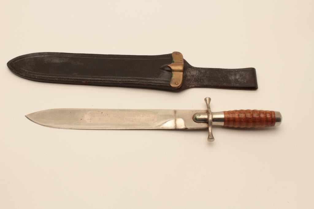 18AN-4 HOSPITAL CORPS KNIFEHospital Corps knife with scabbard. Slight sharpening with some stone scratches at the edge. Almost 100% etching otherwise near fine. Est.: $300-$600Hospital Corps knife with scabbard. Slight sharpening with some stone scratches at the edge. Almost 100% etching otherwise near fine. Est.: $300-$600