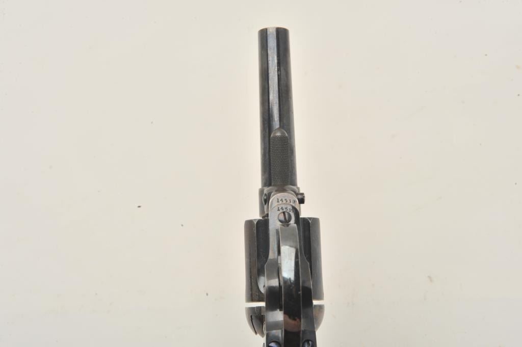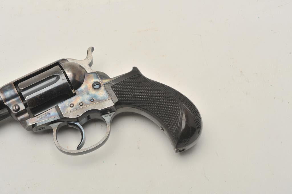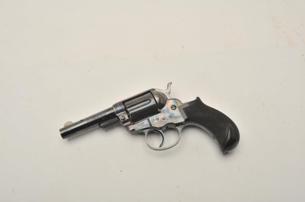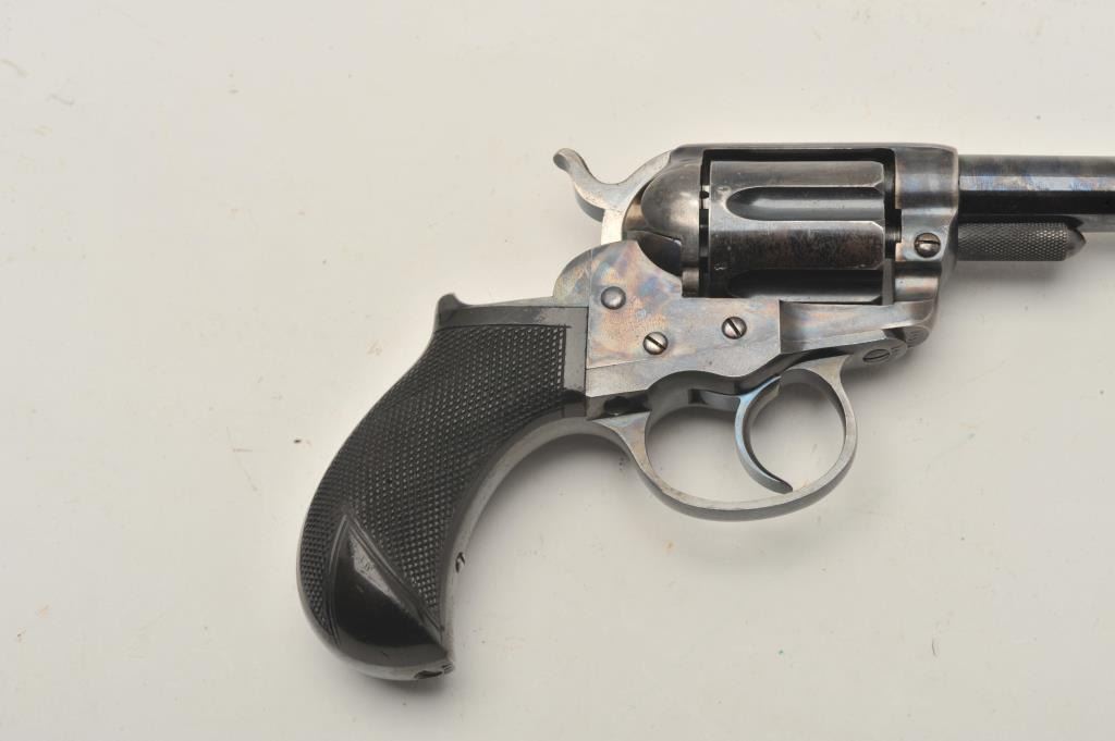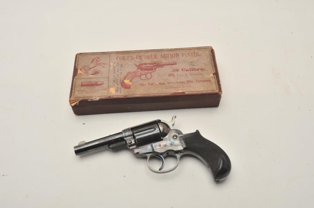 18AN-8 COLT MDL 1877Colt Model 1877 Lighting Store Keepers or Sheriffs model in .38 L.C. caliber with a 3 ½” barrel, checkered rosewood grips, early German silver front sight remaining in original excellent condition with correcttype cardboard picture box, S/N 14539. This revolver shows British proofs with 80%-90% bright original blue with frost etched panel that is 90% plus intact. The cylinder shows slight drifting. The frame shows 85%-95%bright case hardening that is fiery. The grips are almost fine with slight bruises at the high points. The exterior of the box shows a penned over warning about being loaded. The box is good to very good for itsage with normal deterioration of 100 plus years. (Antique) Est.: $6,000-$12,000Colt Model 1877 Lighting Store Keepers or Sheriffs model in .38 L.C. caliber with a 3 ½” barrel, checkered rosewood grips, early German silver front sight remaining in original excellent condition with correcttype cardboard picture box, S/N 14539. This revolver shows British proofs with 80%-90% bright original blue with frost etched panel that is 90% plus intact. The cylinder shows slight drifting. The frame shows 85%-95%bright case hardening that is fiery. The grips are almost fine with slight bruises at the high points. The exterior of the box shows a penned over warning about being loaded. The box is good to very good for itsage with normal deterioration of 100 plus years. (Antique) Est.: $6,000-$12,000