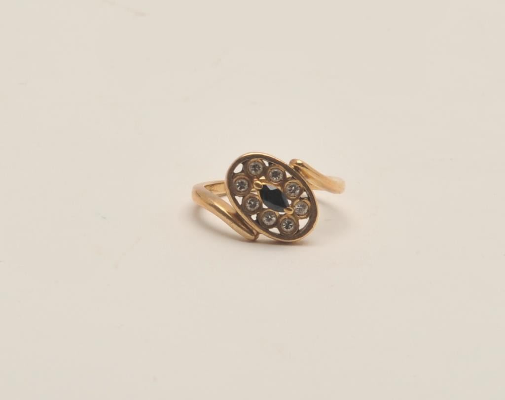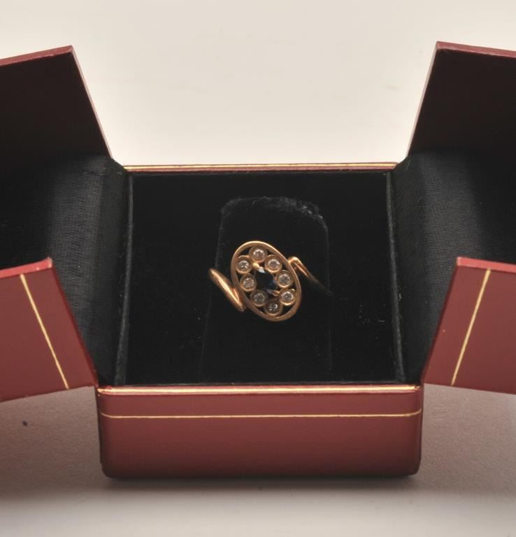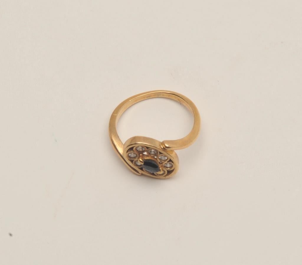 18AO-9 SAPPHIRE & DIAMOND RINGBeautiful 14 karat yellow gold, diamond and sapphire ring. Fresh out of a local estate, the ring is marked 14 karat with a nice marquise cut sapphire surrounded by eight round diamonds. Est.: $350-$500.Beautiful 14 karat yellow gold, diamond and sapphire ring. Fresh out of a local estate, the ring is marked 14 karat with a nice marquise cut sapphire surrounded by eight round diamonds. Est.: $350-$500.