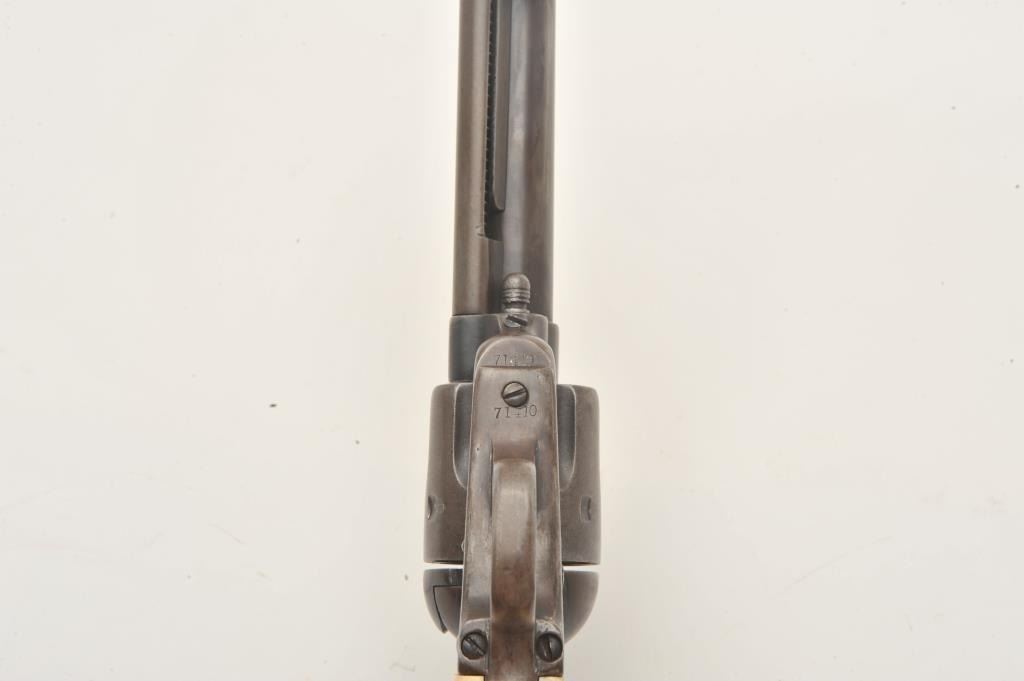 18AP-20 COLT SA #71410Colt SAA revolver, .45 caliber, 4.75” barrel, brown re-finish to metal surfaces, ivory grips, S/N 71410, in overall good condition with crisp action, good markings, bright bore and good grips; backstrap shows what appears to be rose gold appliqués of Western theme images; gun is contained in a modern display case with 6-point older appearing Deputy Sheriff’s badge marked “Richland Co. Mont.”, an ammunition block and old ivory $5 gambling chip. (Antique). Est.: $1,250-$2,500.Colt SAA revolver, .45 caliber, 4.75” barrel, brown re-finish to metal surfaces, ivory grips, S/N 71410, in overall good condition with crisp action, good markings, bright bore and good grips; backstrap shows what appears to be rose gold appliqués of Western theme images; gun is contained in a modern display case with 6-point older appearing Deputy Sheriff’s badge marked “Richland Co. Mont.”, an ammunition block and old ivory $5 gambling chip. (Antique). Est.: $1,250-$2,500.