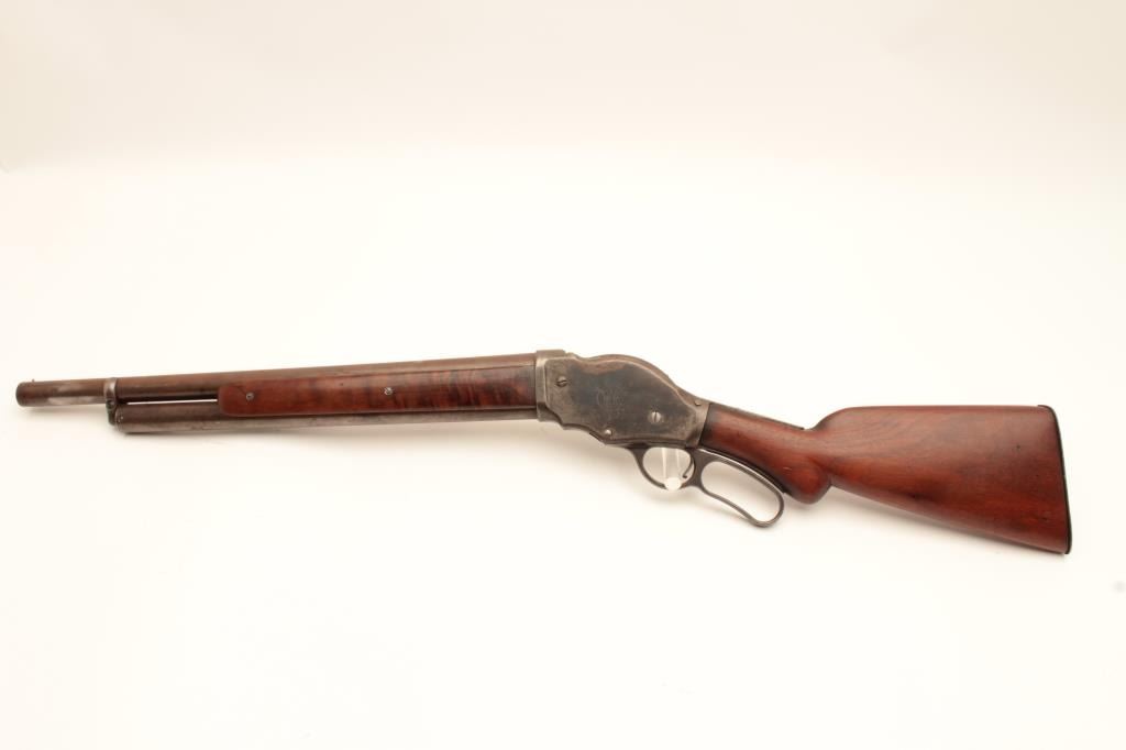 18AP-30 WINCHESTER 1887Winchester Model 1887 lever action shotgun, 10 gauge, Serial #NSNV. The shotgun is in good overall condition with a 20” barrel with a brass post front sight. The barrel and ¾ magazine retain a small amount of blue finish in the protected areas with the remainder going to brown patina with light to moderate surface rust. The receiver retains significant old flaking blue on the left side of the action. The smooth wood stocks arein good condition with contemporary metal star pinned to the butt stock marked, “TERRITORIAL ARIZONA RANGER”. The bore is fair, the action functions and the markings are legible. Est.:$400-$800. (Antique).Winchester Model 1887 lever action shotgun, 10 gauge, Serial #NSNV. The shotgun is in good overall condition with a 20” barrel with a brass post front sight. The barrel and ¾ magazine retain a small amount of blue finish in the protected areas with the remainder going to brown patina with light to moderate surface rust. The receiver retains significant old flaking blue on the left side of the action. The smooth wood stocks arein good condition with contemporary metal star pinned to the butt stock marked, “TERRITORIAL ARIZONA RANGER”. The bore is fair, the action functions and the markings are legible. Est.:$400-$800. (Antique).