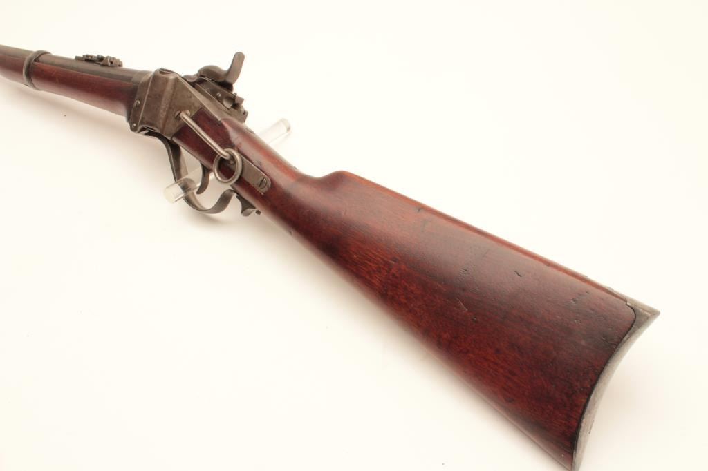 18AP-40 SHARPS SRCSharps New Model 1869 saddle ring carbine, .50-70 caliber, serial #NSNV. The carbine is in good overall condition with a 22” barrel with a post front and military tangent style rear sights. The barrel retains asignificant amount of its muted blue finish with the remainder going to a dark patina. The receiver shows toning case hardening and light surface erosion. The smooth wood stocks are in good condition with small marsand dents consistent with service use. The stock retains the saddle bar and ring along with the barrel band and a smooth steel crescent butt plate. The bore is good, the action is crisp and markings are sharp.Est.: $900-$1,800. (Antique).Sharps New Model 1869 saddle ring carbine, .50-70 caliber, serial #NSNV. The carbine is in good overall condition with a 22” barrel with a post front and military tangent style rear sights. The barrel retains asignificant amount of its muted blue finish with the remainder going to a dark patina. The receiver shows toning case hardening and light surface erosion. The smooth wood stocks are in good condition with small marsand dents consistent with service use. The stock retains the saddle bar and ring along with the barrel band and a smooth steel crescent butt plate. The bore is good, the action is crisp and markings are sharp.Est.: $900-$1,800. (Antique).