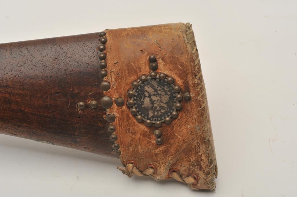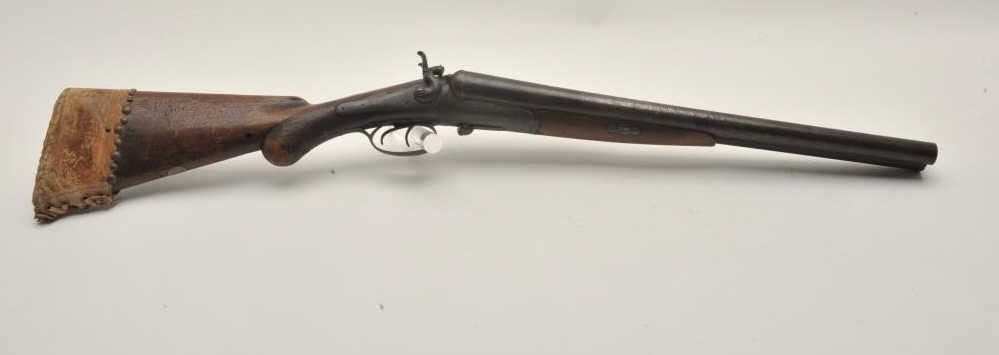 18AP-45 E. JAMES & CO SHOTGUNE. James and Co. side by side double barrel hammer shotgun, 10 gauge, Serial #NSNV. The shotgun is in fair overall condition with Damascus barrels shortened to 18 ¼”. The barrels are a uniform brown with lightsurface erosion noted. The full-length rib contains the barrel address, “E. JAMES and Co., LOVEDAY ST., BIRMm”. The receiver shows modest scroll engraving and a side lever action. The checkered wood stock is in faircondition with a round knob pistol grip with flattening of the checkering and moderate to heavy wear noted. The butt has been leather wrapped and decorated with brass tacks and a Liberty Head silver dollar. This is a neatold English working gun that saw service on the American frontier. Est.: $200-$400. (Antique).E. James and Co. side by side double barrel hammer shotgun, 10 gauge, Serial #NSNV. The shotgun is in fair overall condition with Damascus barrels shortened to 18 ¼”. The barrels are a uniform brown with lightsurface erosion noted. The full-length rib contains the barrel address, “E. JAMES and Co., LOVEDAY ST., BIRMm”. The receiver shows modest scroll engraving and a side lever action. The checkered wood stock is in faircondition with a round knob pistol grip with flattening of the checkering and moderate to heavy wear noted. The butt has been leather wrapped and decorated with brass tacks and a Liberty Head silver dollar. This is a neatold English working gun that saw service on the American frontier. Est.: $200-$400. (Antique).