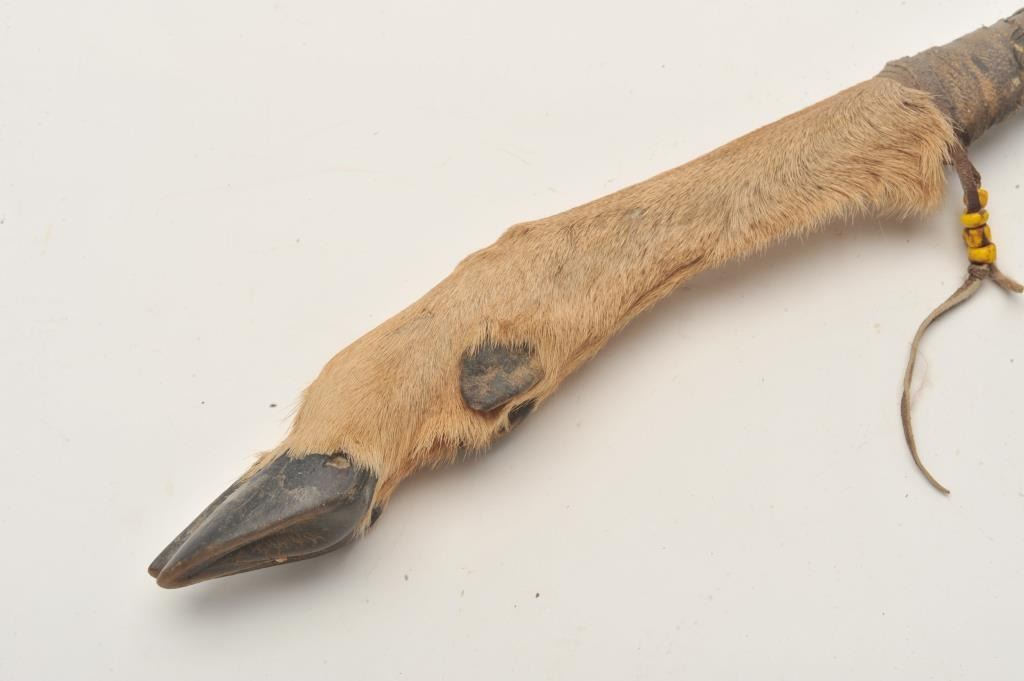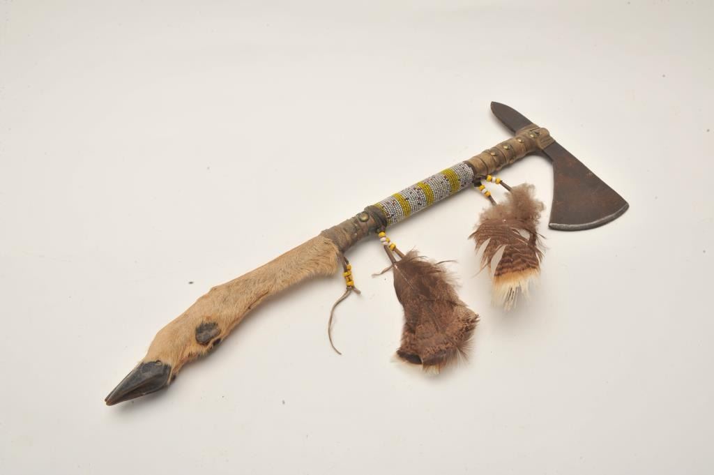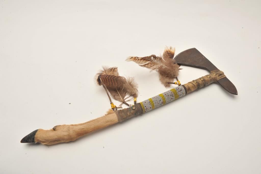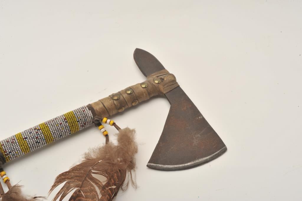 18AP-61 TOMAHAWKTomahawk with beaded shaft and deer foot bottom portion of grip; approximately 21.5” overall with dangles, feathers, etc.; ca. 20th Century showing some age. Est.: $150-$300.Tomahawk with beaded shaft and deer foot bottom portion of grip; approximately 21.5” overall with dangles, feathers, etc.; ca. 20th Century showing some age. Est.: $150-$300.