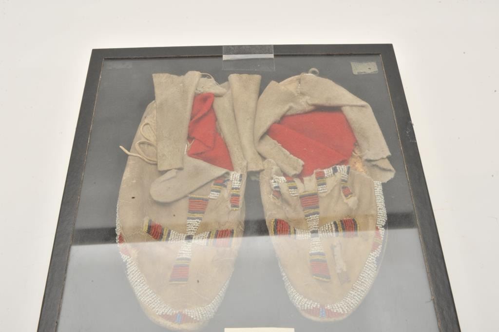 18AP-69 BEADED MOCSPair of Indian beaded moccasins in riker case; cross designs. Est.: $100-$200.Pair of Indian beaded moccasins in riker case; cross designs. Est.: $100-$200.