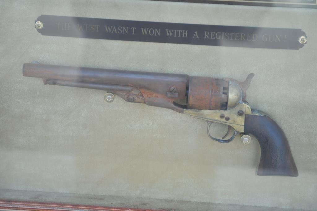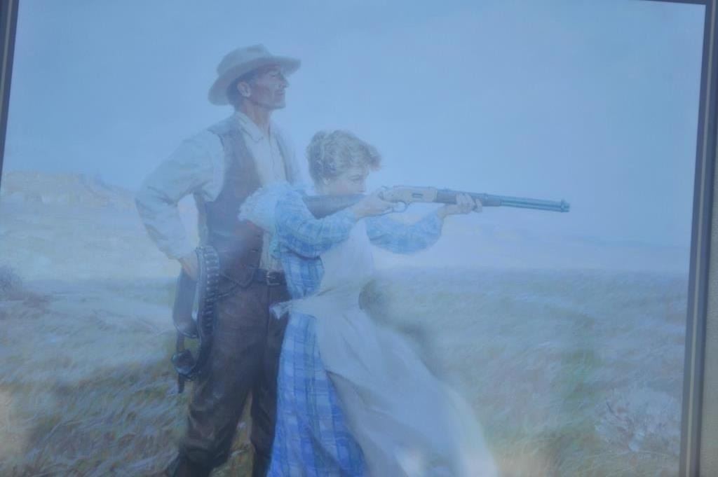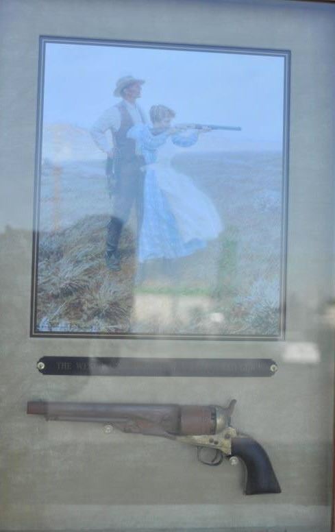 18AP-76 DISPLAYBeautifully deep framed and matted large display entitled “THE WEST WASN’T WON WITH A REGISTERED GUN”; approximately 32” x 21.5” overall; display has a color print of a cowboy teaching a young lady to shoot aWinchester Model 1866 lever action carbine with an aged reproduction of a Model 1860 percussion revolver mounted at the bottom of the display. Est.: $100-$200.Beautifully deep framed and matted large display entitled “THE WEST WASN’T WON WITH A REGISTERED GUN”; approximately 32” x 21.5” overall; display has a color print of a cowboy teaching a young lady to shoot aWinchester Model 1866 lever action carbine with an aged reproduction of a Model 1860 percussion revolver mounted at the bottom of the display. Est.: $100-$200.