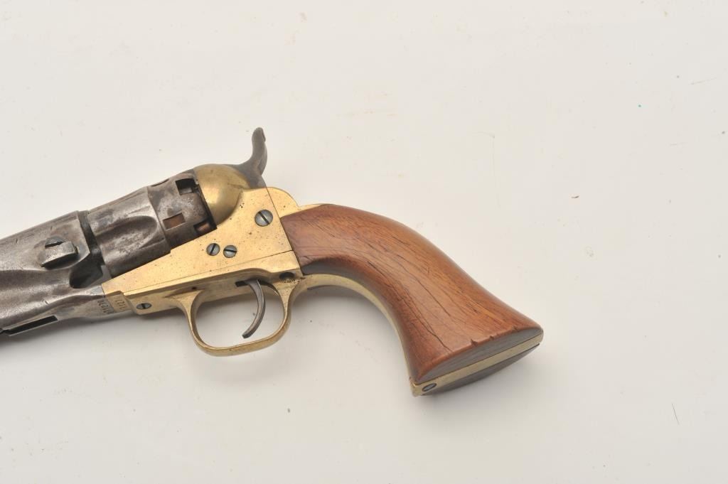 18AP-8 62 POLICE REPROModern reproduction of Model 1862 Police pocket percussion revolver, brass frame, .36 caliber, 5.5” barrel, fluted cylinder, S/N B71276, in overall good condition with good action, grey patina to iron barrel andcylinder, good grips. (percussion). Est.: $50-$100.Modern reproduction of Model 1862 Police pocket percussion revolver, brass frame, .36 caliber, 5.5” barrel, fluted cylinder, S/N B71276, in overall good condition with good action, grey patina to iron barrel andcylinder, good grips. (percussion). Est.: $50-$100.