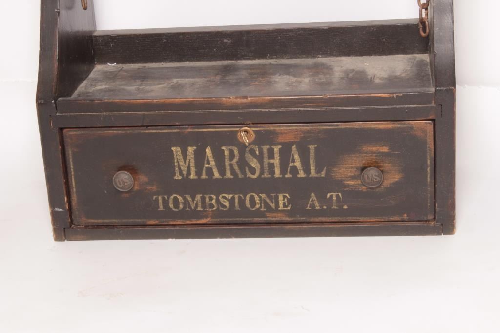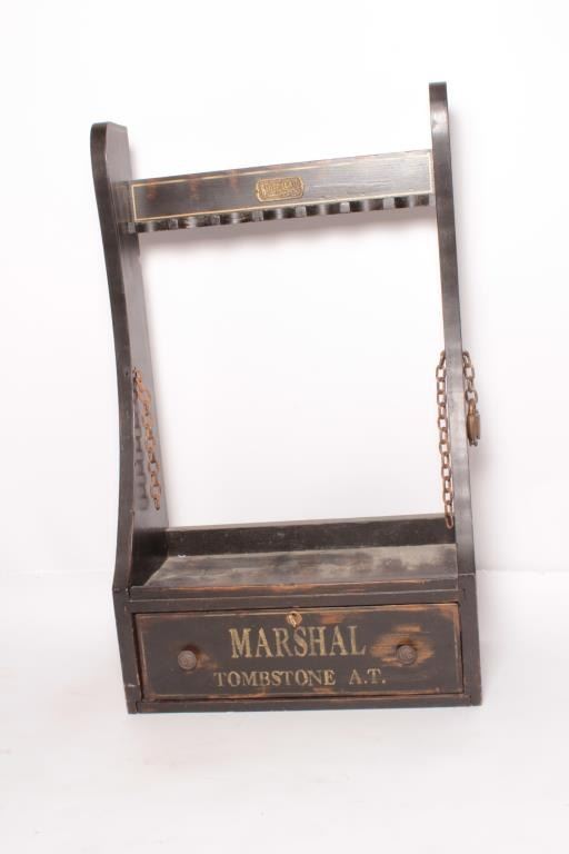 18AP-90 RACK WESTERN STYLEWestern style wood 7 position rifle rack with bottom drawer that is painted “Marshal/Tombstone A.T.”; approximately 40” high x 24” wide x 12” deep; nicely constructed with retaining chains and lockplus misc. items in drawer including two pair of SAA simulated grips. Est.: $150-$300.Western style wood 7 position rifle rack with bottom drawer that is painted “Marshal/Tombstone A.T.”; approximately 40” high x 24” wide x 12” deep; nicely constructed with retaining chains and lockplus misc. items in drawer including two pair of SAA simulated grips. Est.: $150-$300.