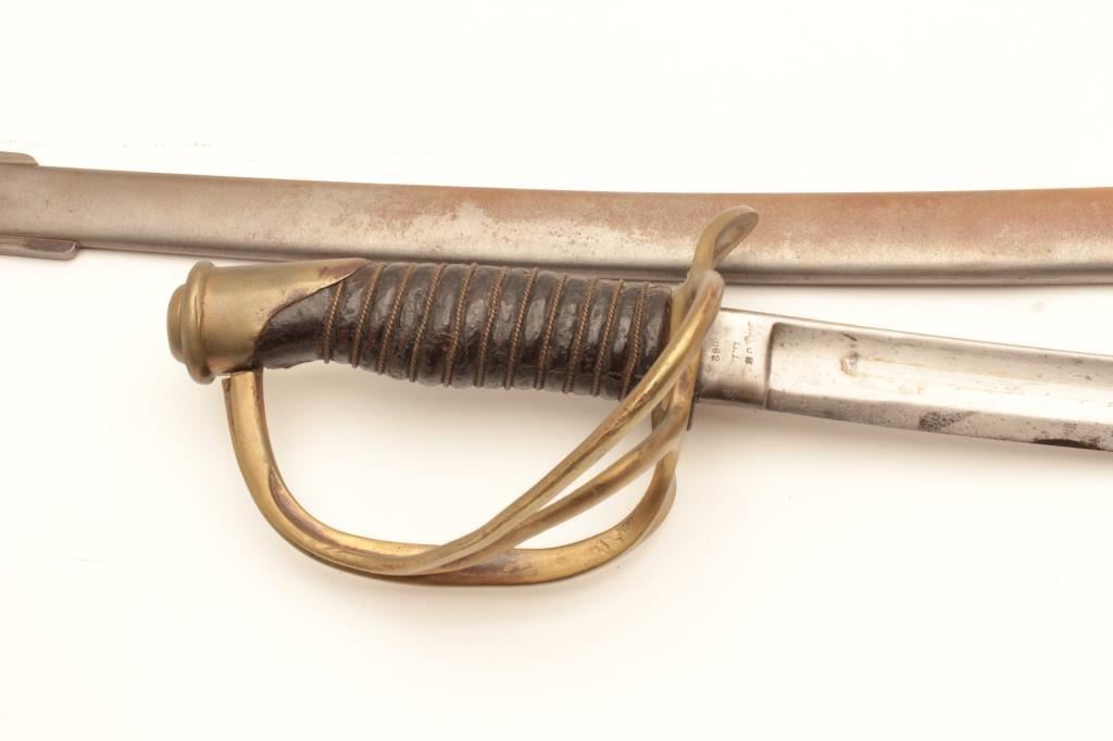18AP-91 CAVALRY SWORDModel 1860 Light Cavalry Saber. The saber is in good overall condition with a 35” blade and an overall length of 41”. The blade is in good condition with light surface erosion and discoloration but no apparent sharpening. The blade is US marked and dated 1862 at the hand guard. The saber features a brass guard, leather and wire wrapped grip and steel scabbard. The scabbard shows light to moderate surface rust. Est.: $200-$400.Model 1860 Light Cavalry Saber. The saber is in good overall condition with a 35” blade and an overall length of 41”. The blade is in good condition with light surface erosion and discoloration but no apparent sharpening. The blade is US marked and dated 1862 at the hand guard. The saber features a brass guard, leather and wire wrapped grip and steel scabbard. The scabbard shows light to moderate surface rust. Est.: $200-$400.