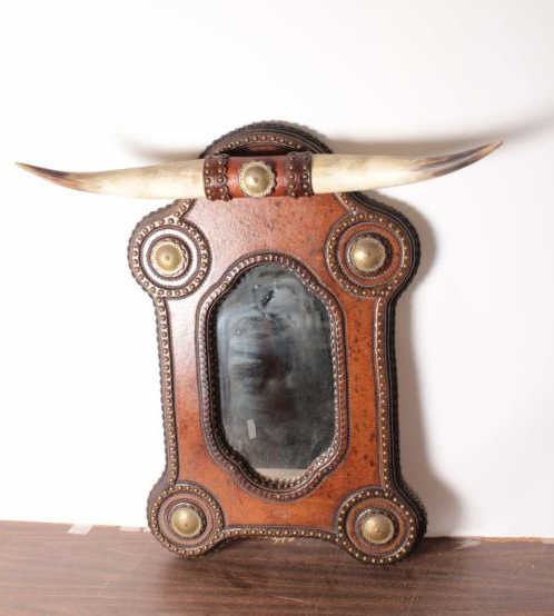 18AP-93 HALL MIRRORBeautifully made large Western style hall mirror, approximately 35” x 34” overall, accented with leather, brass conchos and brass tacks; topped with a pair of steer horns; a great looking decorator! Est.: $150-$300.Beautifully made large Western style hall mirror, approximately 35” x 34” overall, accented with leather, brass conchos and brass tacks; topped with a pair of steer horns; a great looking decorator! Est.: $150-$300.