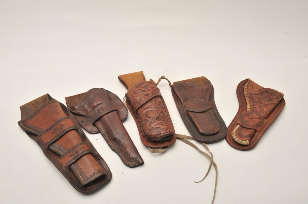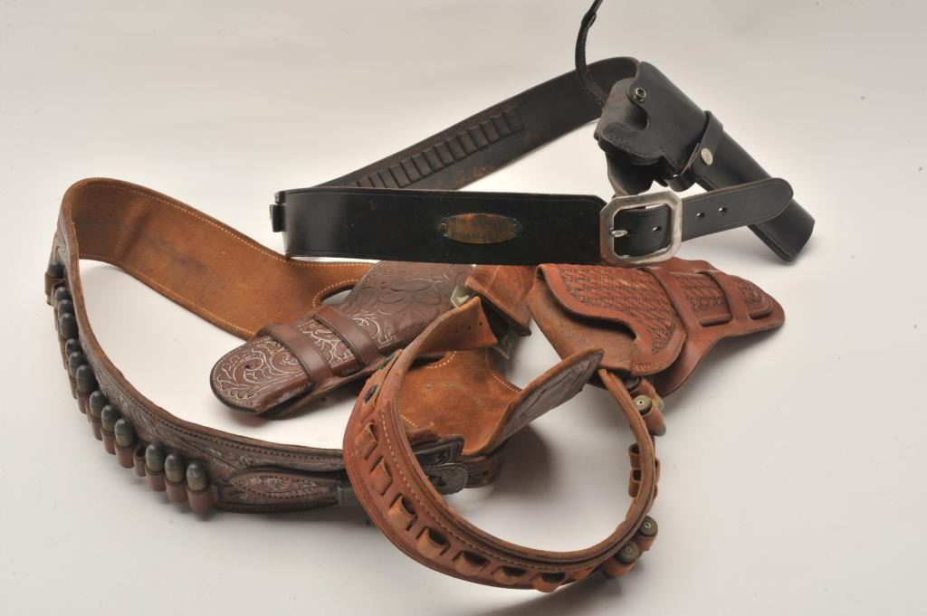 18AP-95 HOLSTER LOTBonanza lot of Western leather of varying age, approximately 26 holsters, 6 holster rigs, 1 pair of old saddlebags and 1 quirt; a great array of items with some maker-marked! Est.: $300-$500.Bonanza lot of Western leather of varying age, approximately 26 holsters, 6 holster rigs, 1 pair of old saddlebags and 1 quirt; a great array of items with some maker-marked! Est.: $300-$500.
